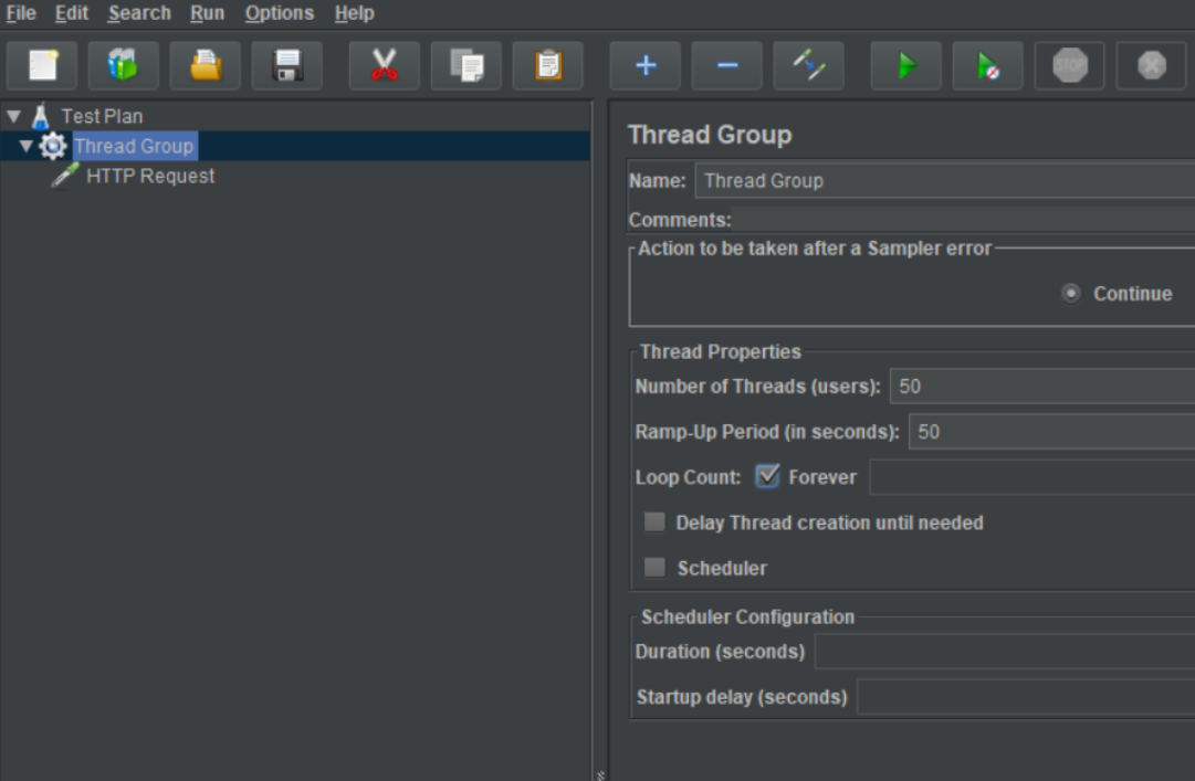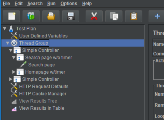 Создается общий Test Plan, в который закидывается Thread Group с основными элементами теста: контроллеры, управляющие процессом, и запросы (HTTP, FTP и т.д.).