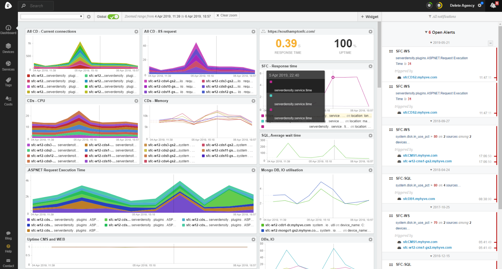 Такие сообщения на пустом месте не появляются, поэтому мы провели исследование: запустили утилиту для отслеживания состояние серверов Server Density и посмотрели, что происходит с ними во время наплыва пользователей на сайте: