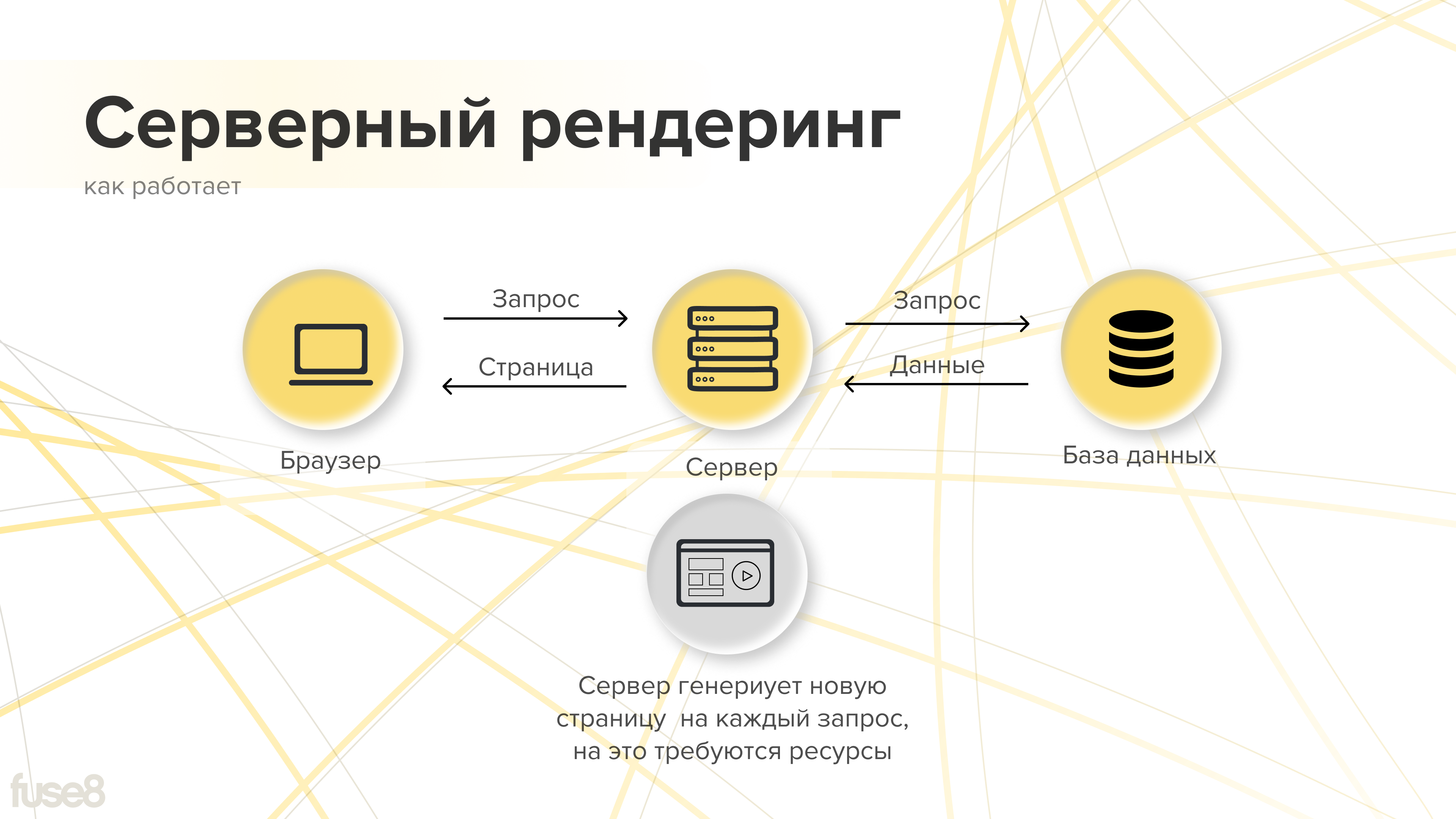 Серверный рендеринг (server side rendering / SSR) – подход, в котором страница генерируется на сервере при каждом запросе от пользователя.