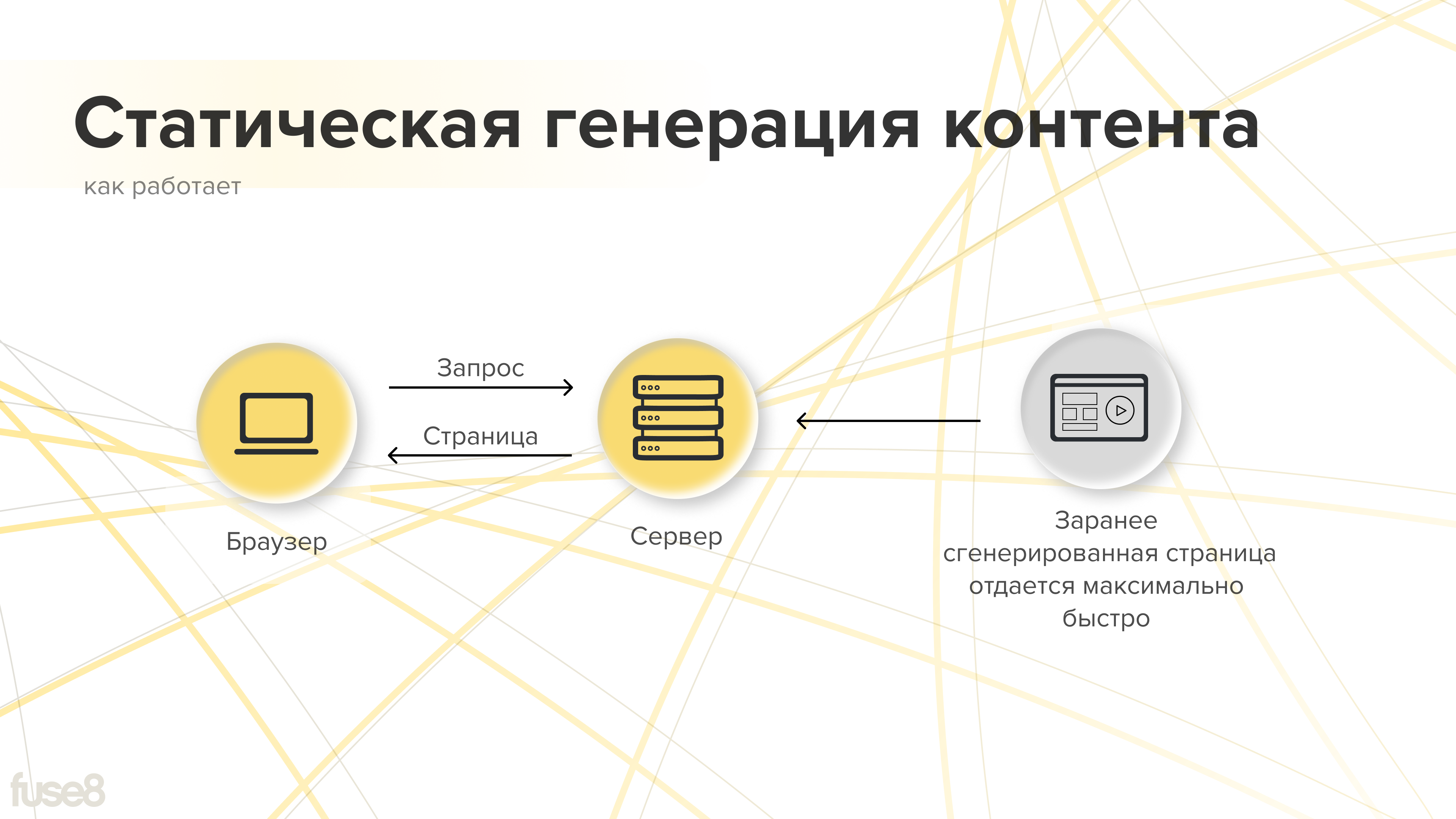 Статическая генерация сайта (static site generation или SSG) – подход, при котором HTML код страниц генерируется один раз в момент публикации и сохраняется на сервере. Изменения в этой публикации не появляются (либо появляются очень редко), поэтому генерация «статическая». Дальше сервер будет моментально отдавать HTML код готовой страницы пользователям и поисковикам, гарантируя быструю загрузку страницы.