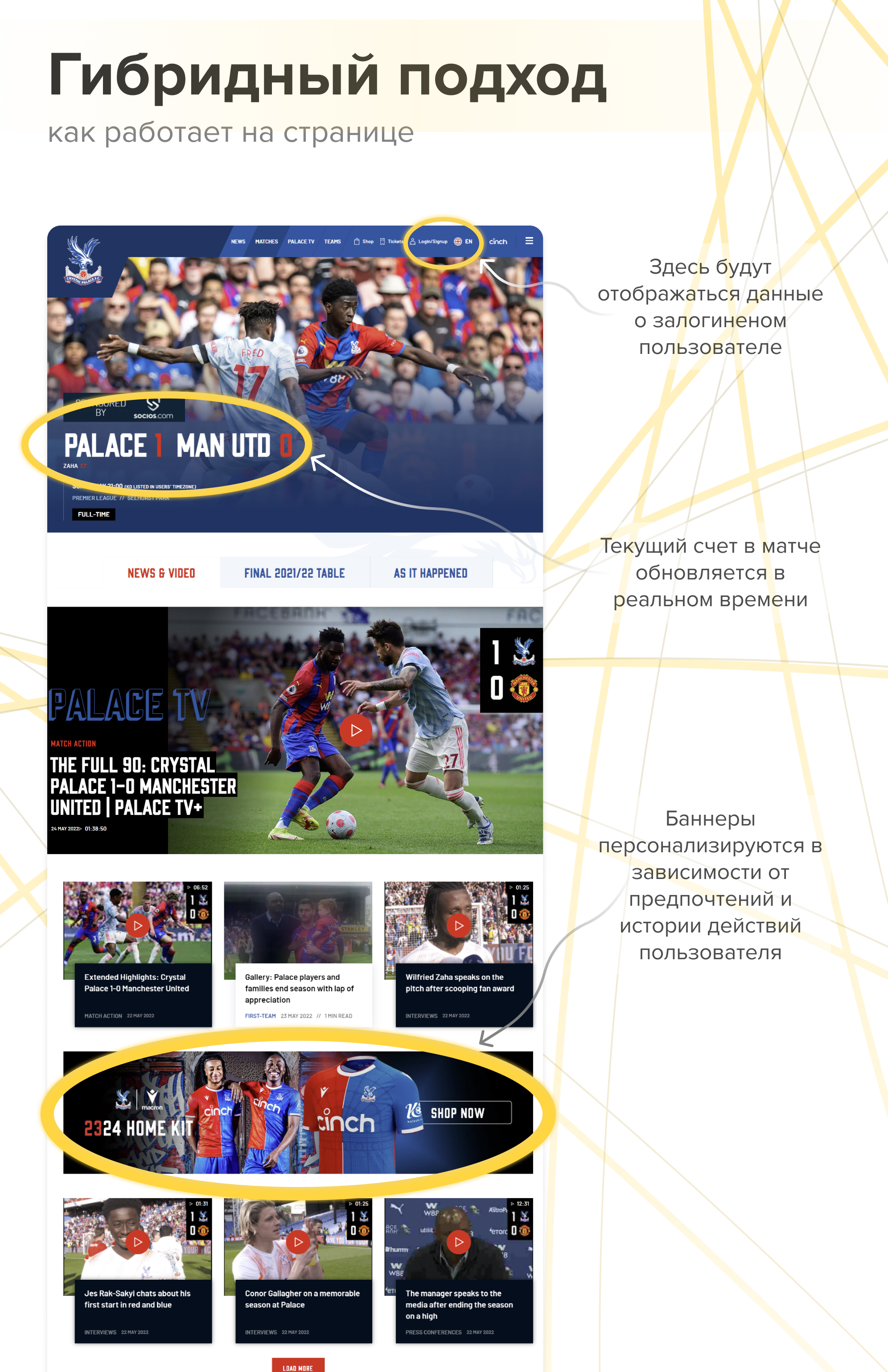 Так, на сайте нашего проекта для Crystal Palace FC большинство контента генерируется статически. При этом отдельные блоки рендерятся в браузере. Это, например, индивидуальные для пользователя блоки или очень динамические сегменты.