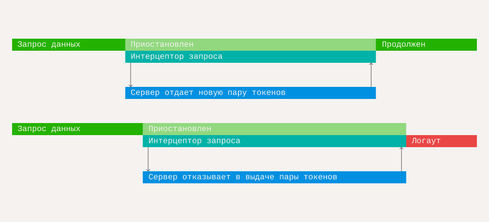 Проверка срока жизни токена перед отправкой запроса. Перед отправкой каждый запрос обрабатывается интерцептором. В нем текущее время сравнивается со временем конца жизни access token. Если его срок пришел, то приложение смотрит на срок жизни refresh token и, если это возможно, обновляет пару. Если нет — разлогинивает пользователя.