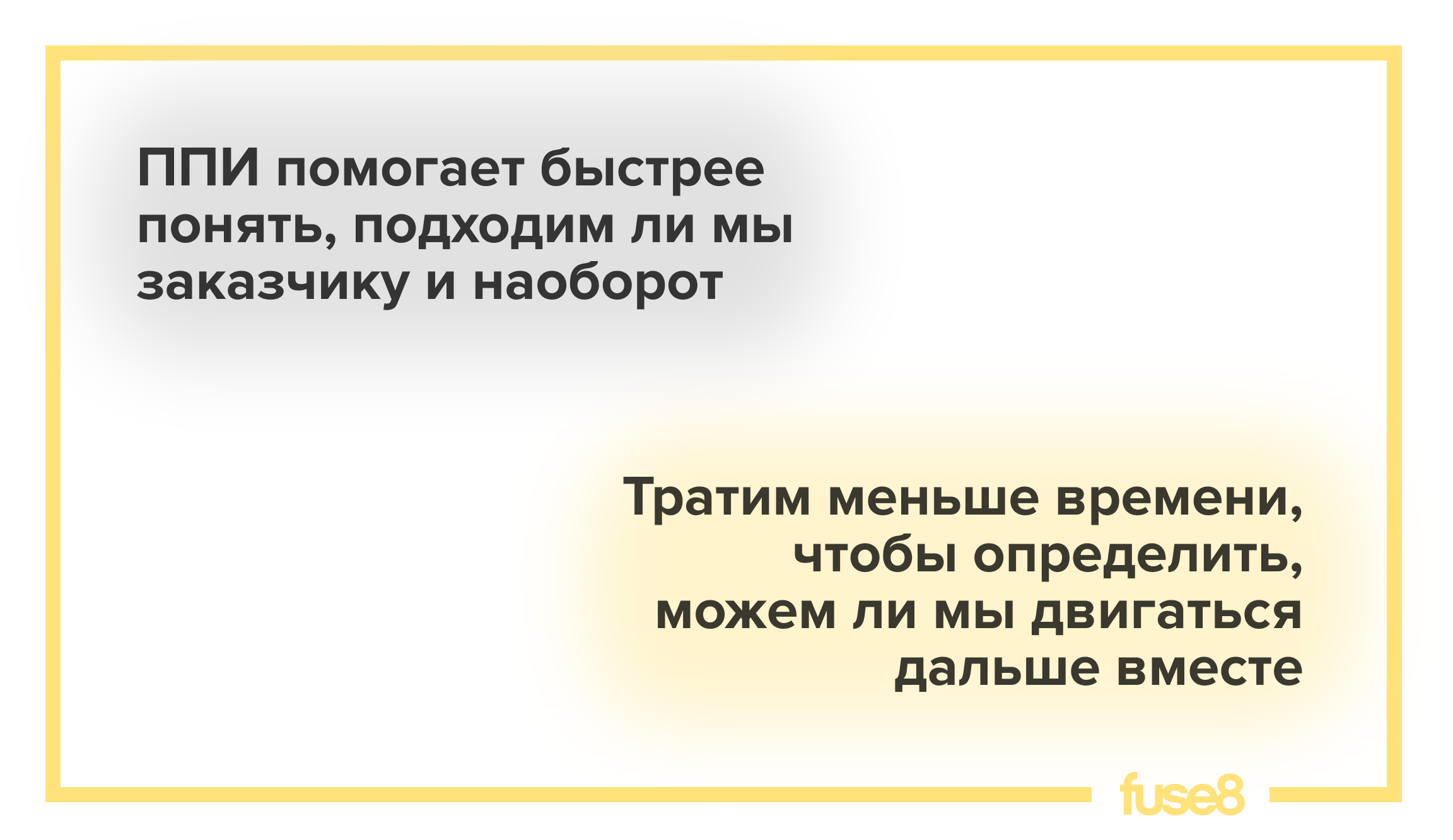 Обычно мы на первых двух встречах понимаем, что заказчику нужно ППИ. Уже здесь можем рассказать об этом этапе, о вилке цен и сроках.