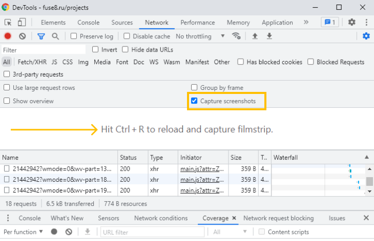 Одна из самых полезных функций в DevTools — серия снимков в процессе загрузки страницы. С ее помощью можно отловить какие-то баги и нелогичное поведение элементов в процессе построения страницы. Или посмотреть, появляется ли при загрузке спиннер или прогресс-бар (если вдруг у вас такой шустрый интернет, что визуально вы этого отследить не можете).