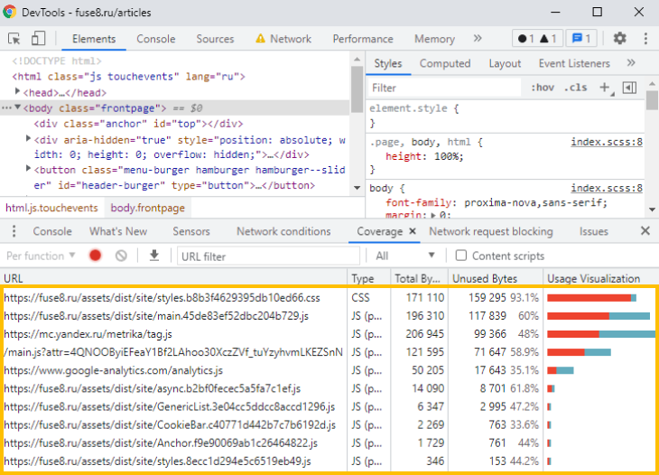 Еще одна интересная и незаменимая при тестировании производительности функция DevTools — обнаружение неиспользуемых в вёрстке CSS и JavaScript.