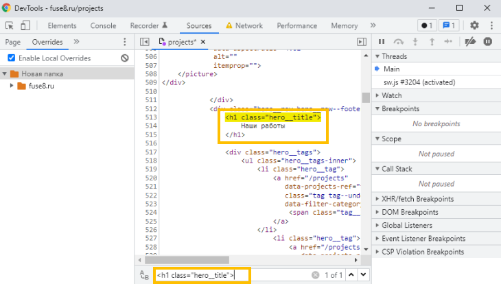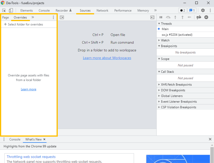 Возвращаясь к разделу нашей статьи «Поиск неиспользуемых CSS и JS в вёрстке», с помощью локальных переопределений вы можете самостоятельно удалить найденный «лишний код» и посмотреть, как это скажется на скорости загрузки страницы. А еще, если вы и сами своего рода разработчик, можно попробовать как-то оптимизировать уже существующий код. Например, изменить порядок блоков и посмотреть, как это отразится на производительности.