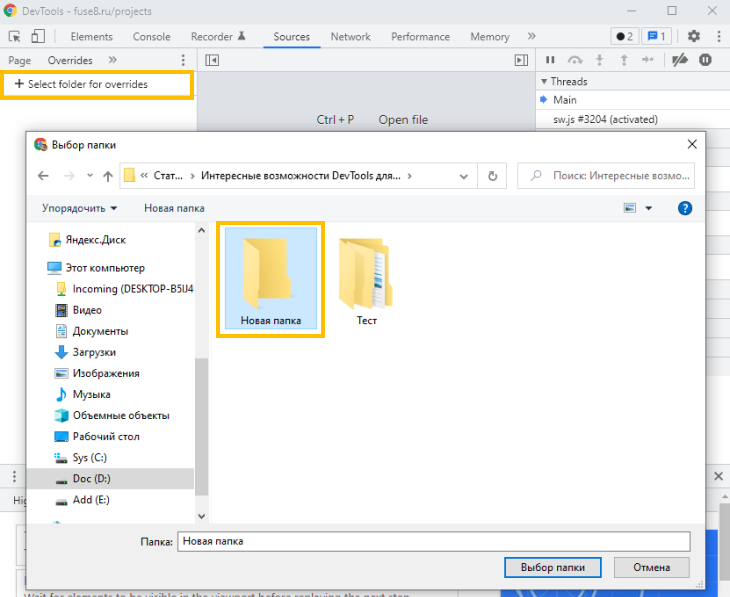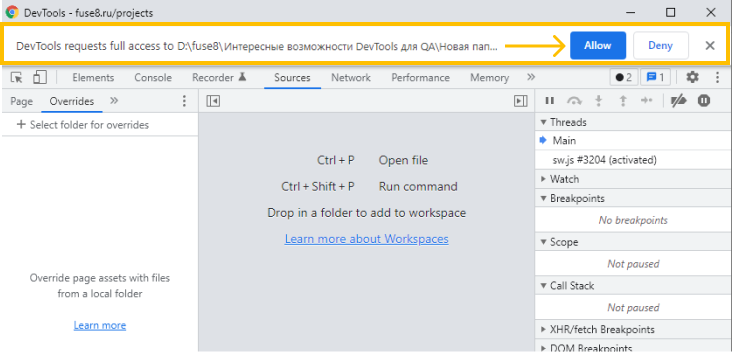 6. Во всплывающем окне разрешите доступ DevTools к выбранной папке.