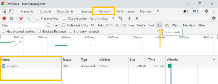 7. Найдите файл с кодом страницы во вкладке Network. Для этого нужно перезагрузить страницу и сортировать все по Doс. Чаще всего этот файл называется index.html. В нашем примере ниже это Projects.
