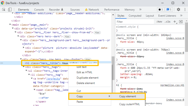 9. Для этого найдите код нужного элемента во вкладке Elements с помощью специального инструмента (Ctrl+Shift+C) и скопируйте его.