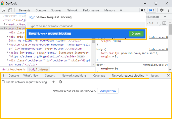 2. Введите Show Request Blocking и выберите Show Network Request Blocking. Ниже откроется панель Network Request Blocking.
