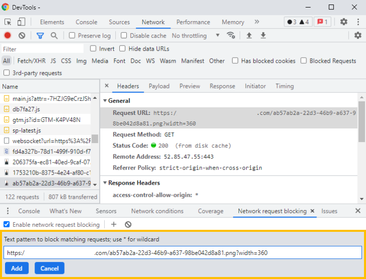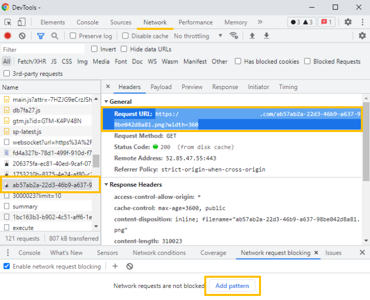 4. Из меню Headers скопируйте его и нажмите на кнопку Add Pattern в панели Network Request Blocking.