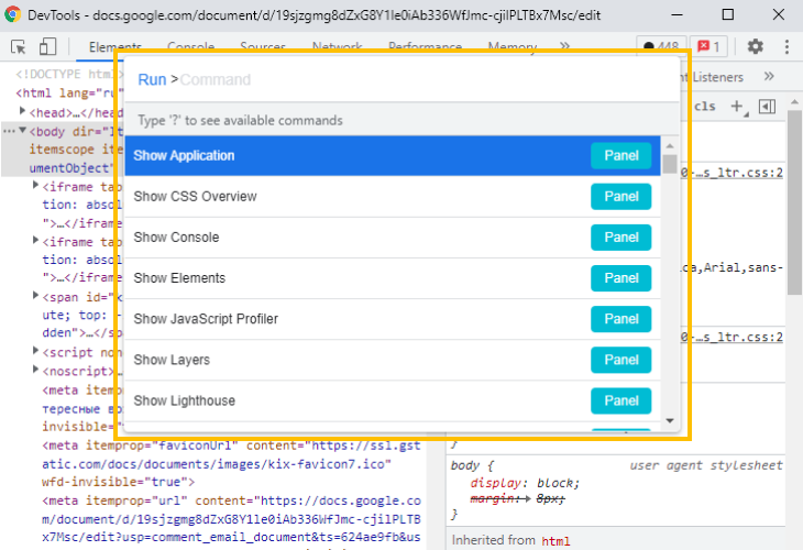 1. Откройте панель разработчика (F12) и вызовите Command Menu (Ctrl+Shift+P).