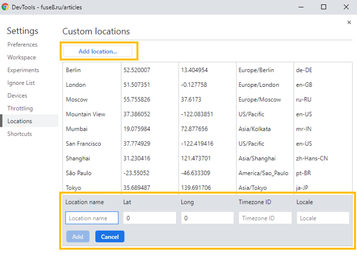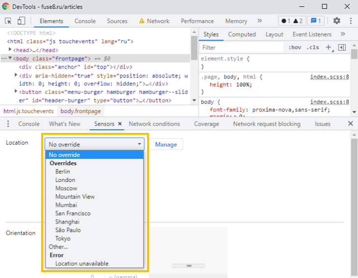 Через DevTools можно переопределить локацию пользователя, чтобы проверить, как сайт будет выглядеть для жителей разных городов/стран/часовых поясов. Показывает ли он челябинскую погоду жителю Челябинска? Учитывает ли часовой пояс посетителя из европы, который смотрит расписание игр на сайте канадского хоккейного клуба? Все это мы можем выяснить, просто переопределив геолокацию в DevTools.