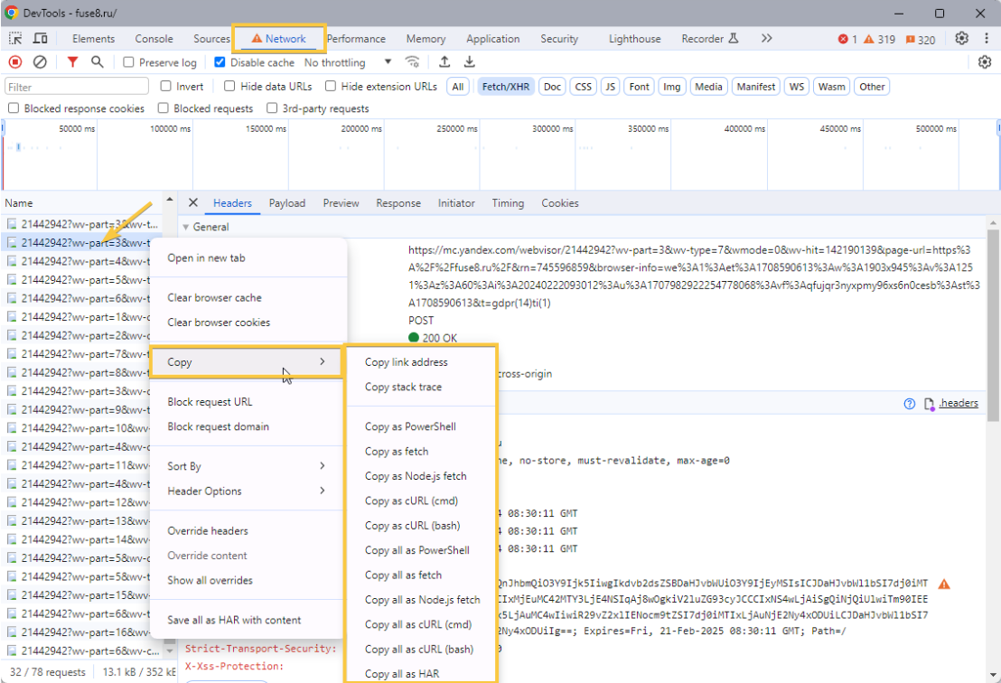 - Выберите Copy и нужный вам вид (Fetch, cURL и тд)