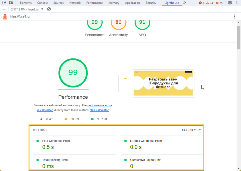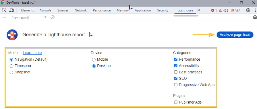 Один из способов протестировать производительность сайта, а также accessibility и SEO оптимизацию – это Lighthouse, который теперь встроен в DevTools.