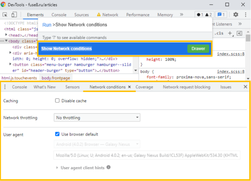 2. Введите Show Network conditions и нажмите Enter. После этого в нижней части DevTools откроется вкладка Network conditions.