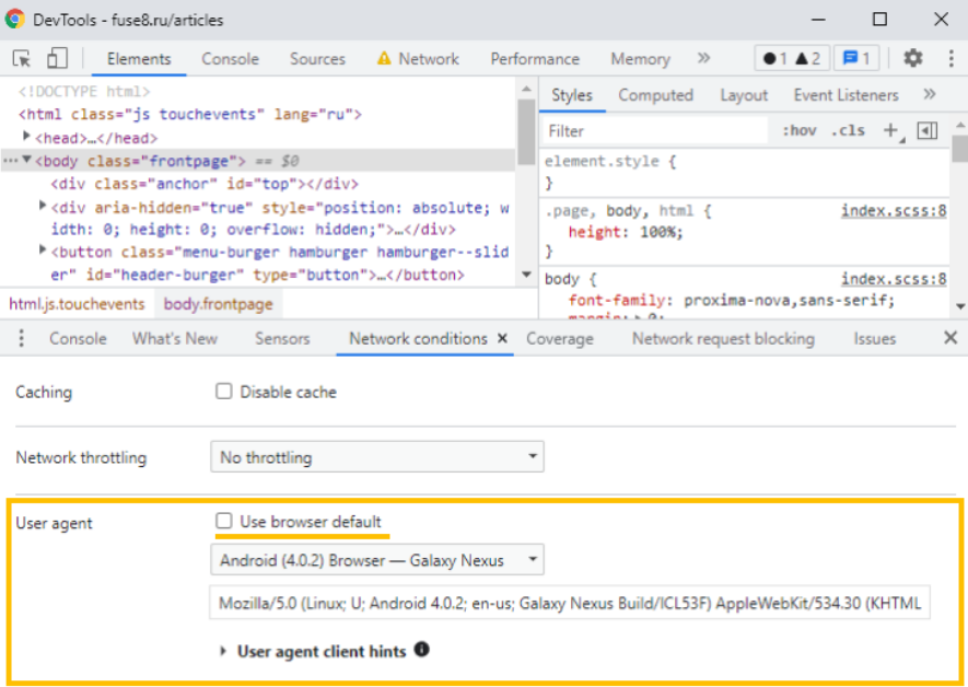 Чтобы проверить, меняются ли стили на сайте в зависимости от разных устройств, ОС и браузеров, не обязательно обкладываться маками, айфонами, разными планшетами и т.д. Можно просто сменить User-Agent в DevTools и проверить сайт с одного устройства.