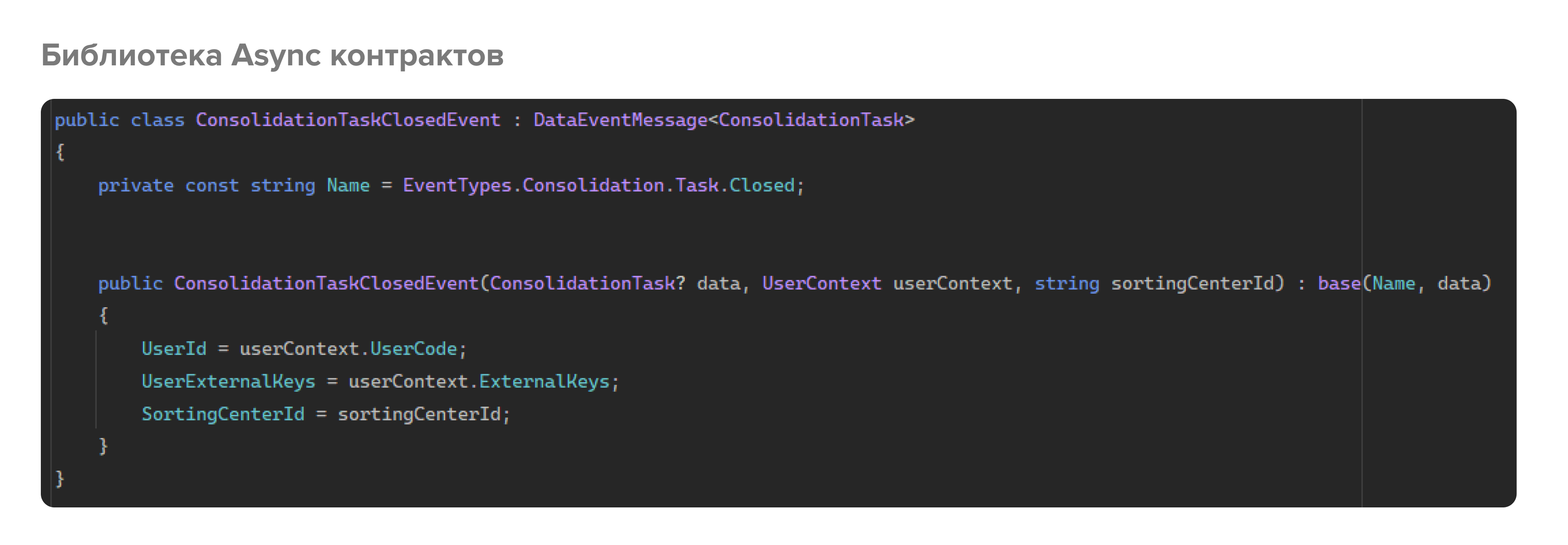 Библиотека Async контрактов – nuget-пакет на основе спецификации. Внутри содержатся модели сообщений, которые отправляются или читаются в очередь или из нее.