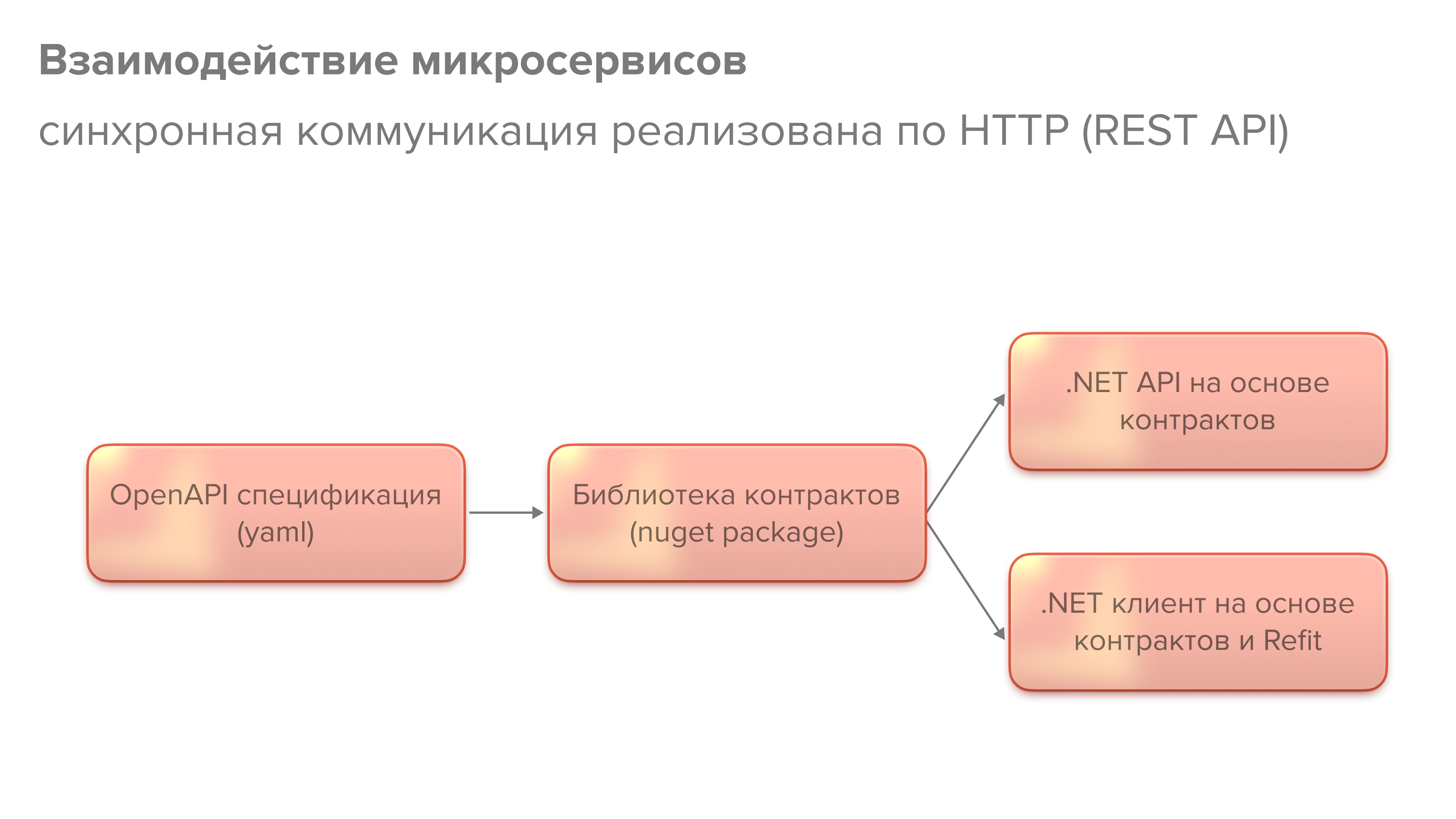 На схеме крупными мазками изображен подход к разработке API нового микросервиса. Сначала мы создаем спецификацию API в формате OpenAPI, утверждаем её с отделом архитектуры, а на ее основе создаем библиотеку контрактов, содержащую интерфейсы и структуры данных API . После этого на ее основе можно создавать API и клиентов, которые будут пользоваться этим API. Для разработки клиентов мы применяем библиотеку Refit.