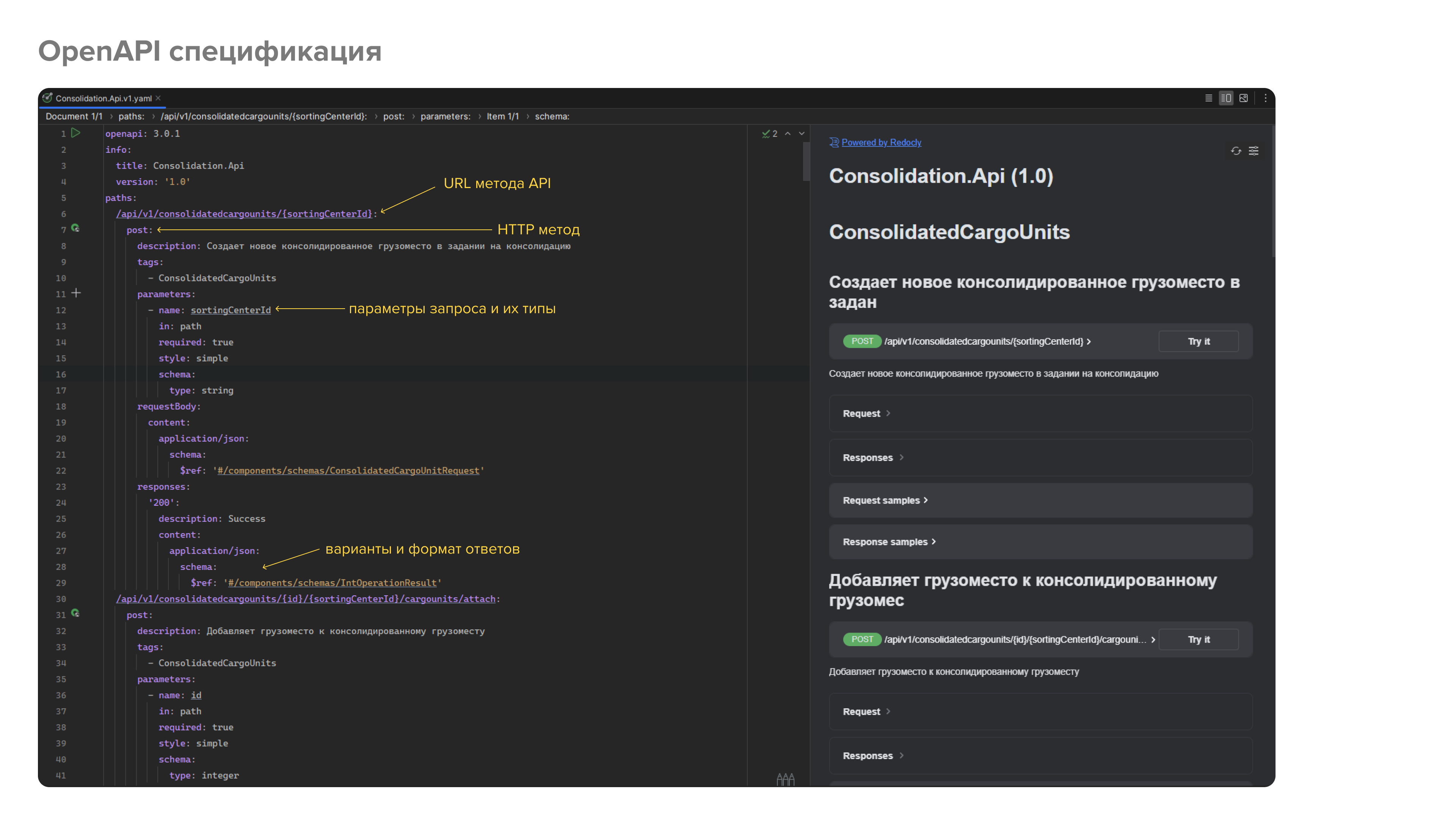 Вот так выглядит OpenAPI спецификация. В IDE Rider есть плагин, который позволяет ее редактировать и как Swagger генерирует описание спецификации. Тут описаны все методы этого API, структуры запросов и ответов. Когда эта спецификация утверждена, приступаем к разработке библиотеки контрактов.