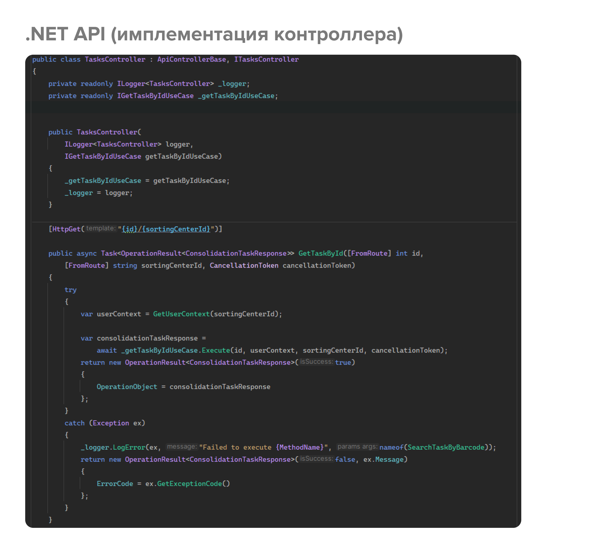Вот так выглядит класс API-контроллера, в котором мы реализуем интерфейс контроллера с необходимой бизнес-логикой. Здесь стоит заметить, что используются ASP.NET атрибуты, и это один из недостатков подхода – приходится дублировать маршруты как в библиотеке контрактов, так и в самих контроллерах. Для простых случаев, когда это маршруты без ограничений (например, {id}/{sortingCenterId}), их можно вынести в константы и переиспользовать, но когда в маршруты закладываются ограничения (например, {id:int}/{sortingCenterId}),а т.к. семантика, заложенная в ASP.NET не поддерживается Refit’ом (и наоборот), то такие маршруты приходится дублировать.