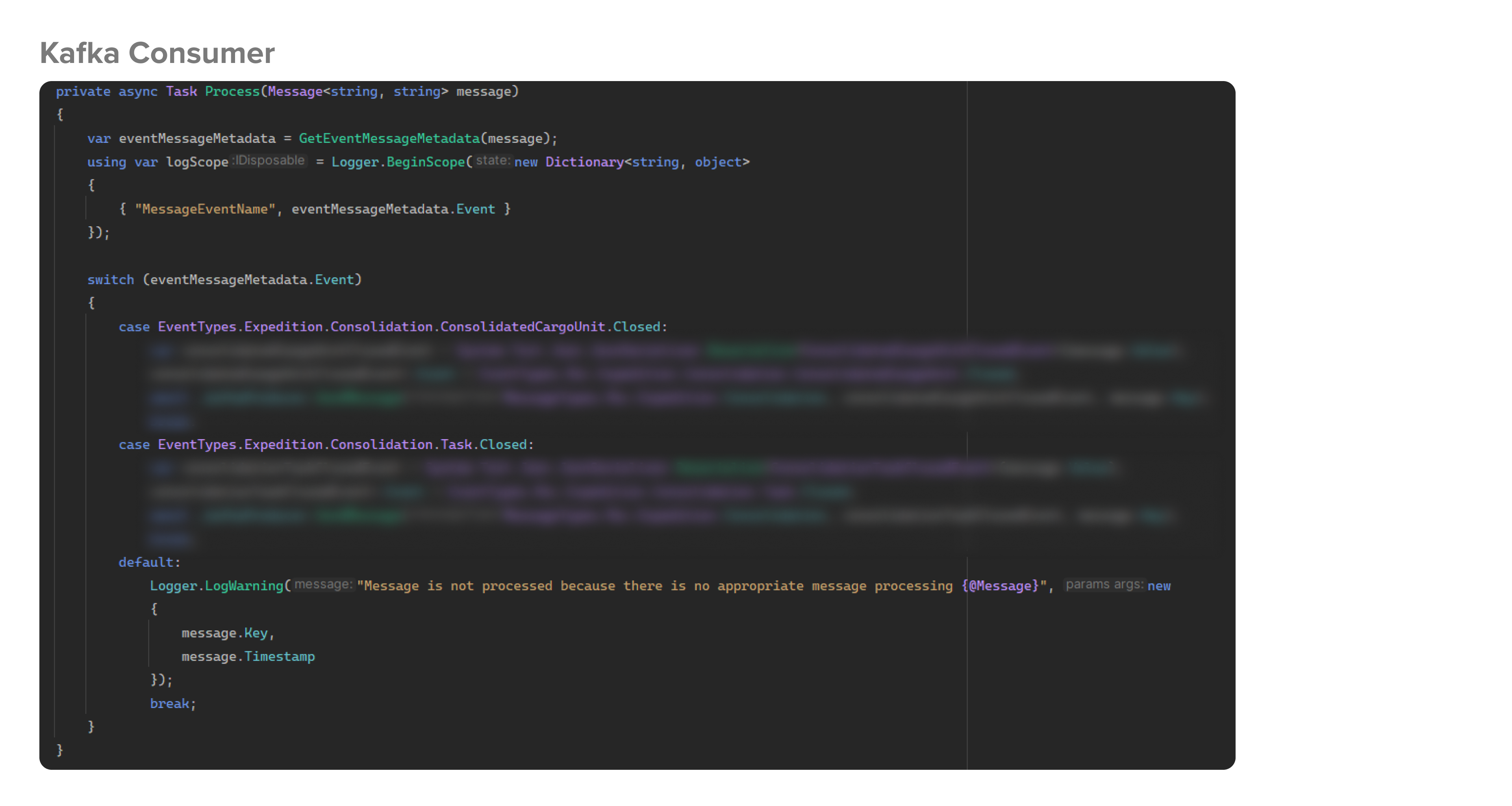 На скрине выше показан консьюмер. Это обработчик, в который приходят все сообщения: в нем есть фильтрация и обычно тут идет обработка бизнес-логики, которая должна срабатывать при получении сообщения.