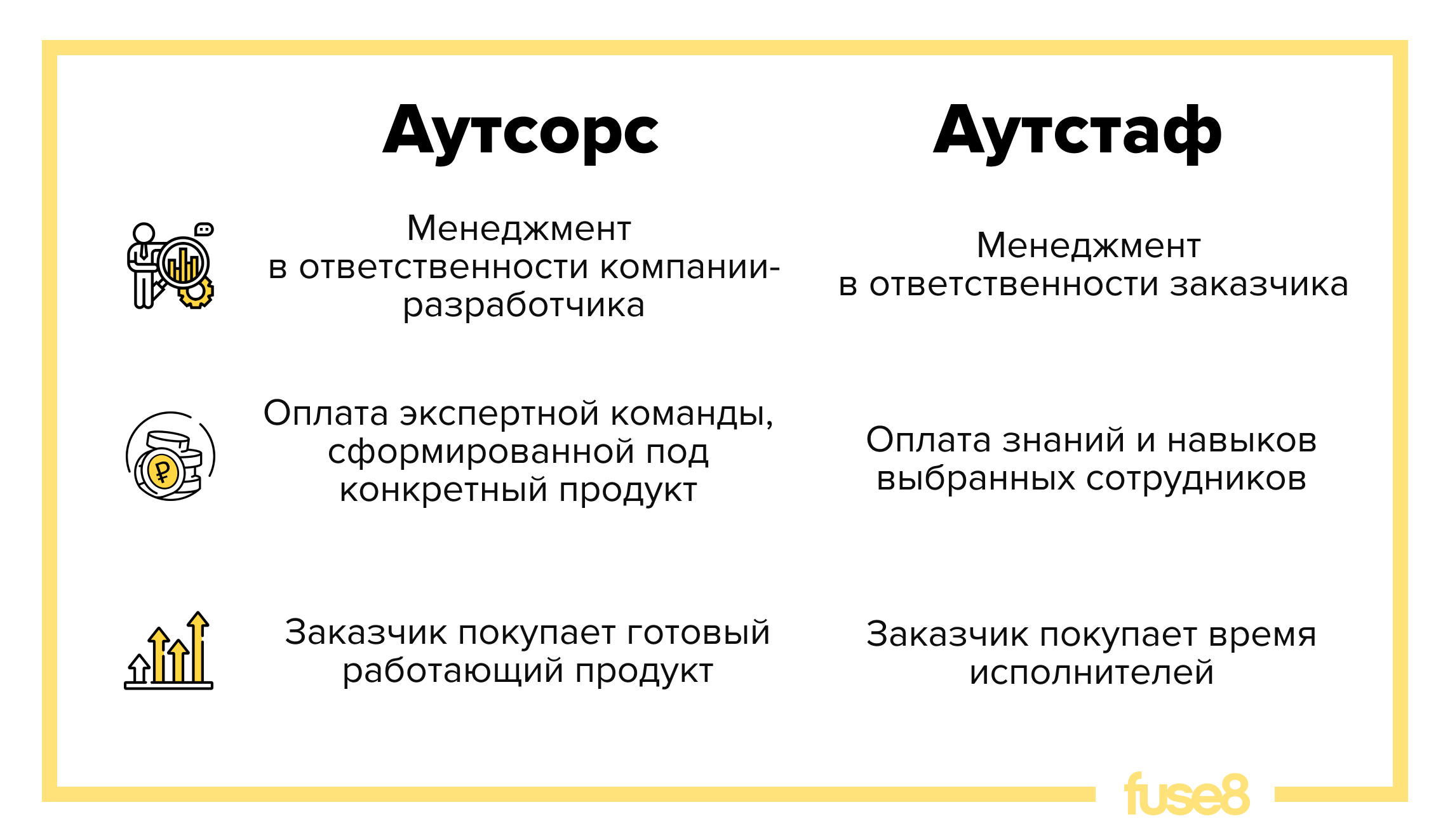 Такой подход берет от аутстафа покупку-продажу часов и «рабочих рук», а от аутсорса – продуктовое видение задачи и экспертизу для разработки с учетом целей проекта. Взять готовую команду с проверенным опытом проще, чем тратить время на HR-активности: поиск, найм и онбординг. Все это отдалит время релиза, получения прибыли и результатов.