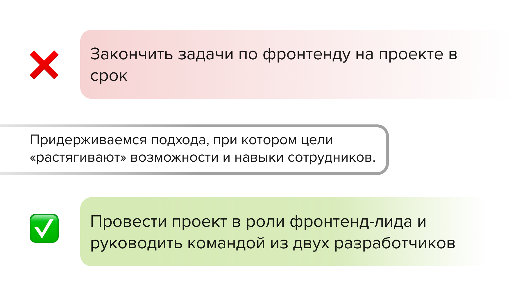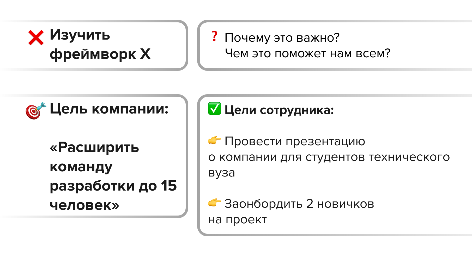 - Ставит сотруднику цели по развитию на следующие 6 месяцев