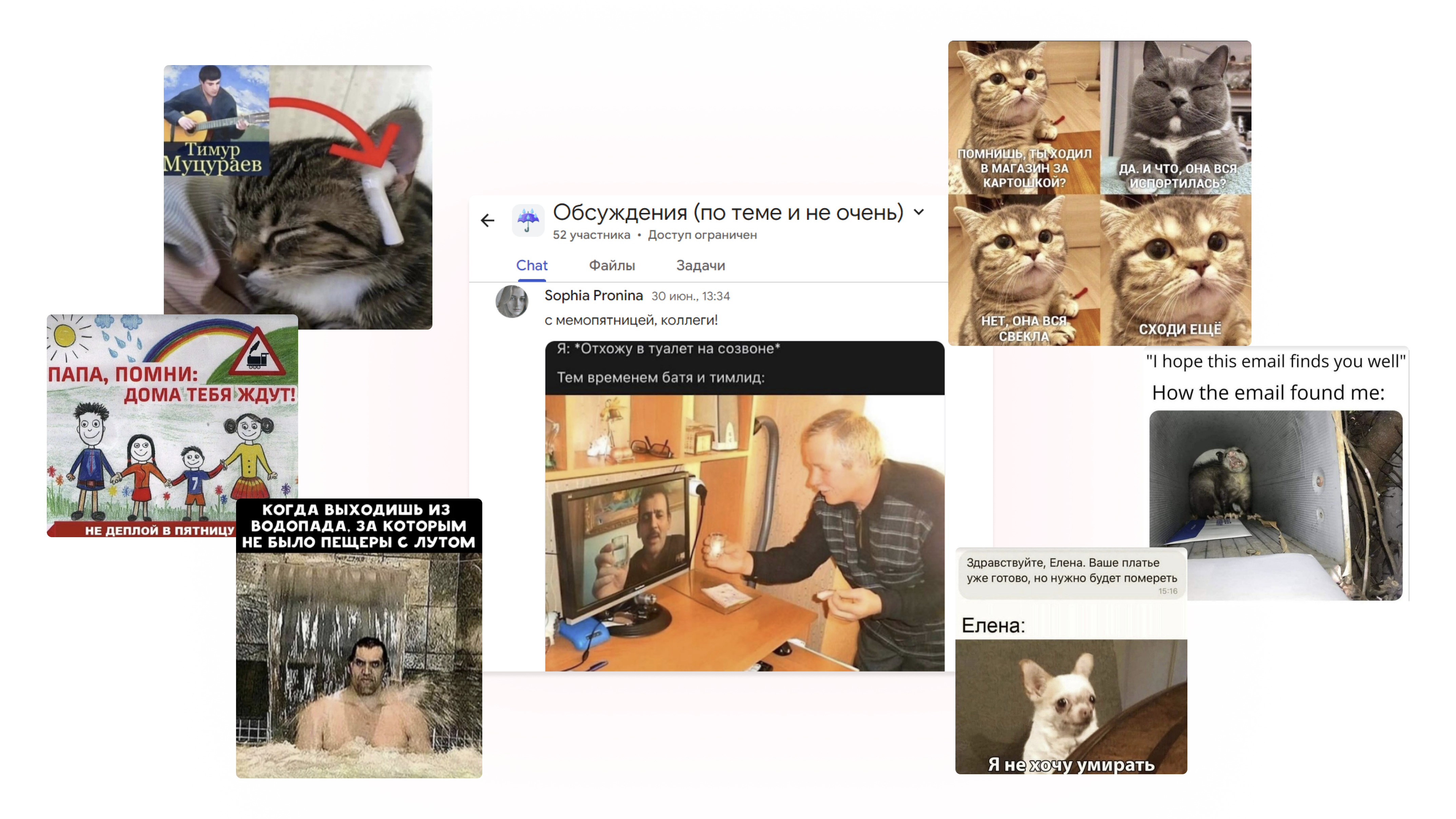 Сначала зачинщиком процесса была София, а теперь мемную цепочку у нас запускают другие члены команды, как только открывают общий чат пятничным утром. Может, от хронической усталости эта активность и не излечит, но юмор точно объединяет. Да и закрывать задачи в конце недели становится проще, когда в любой момент можно зайти в общий чат и улыбнуться от присланного.