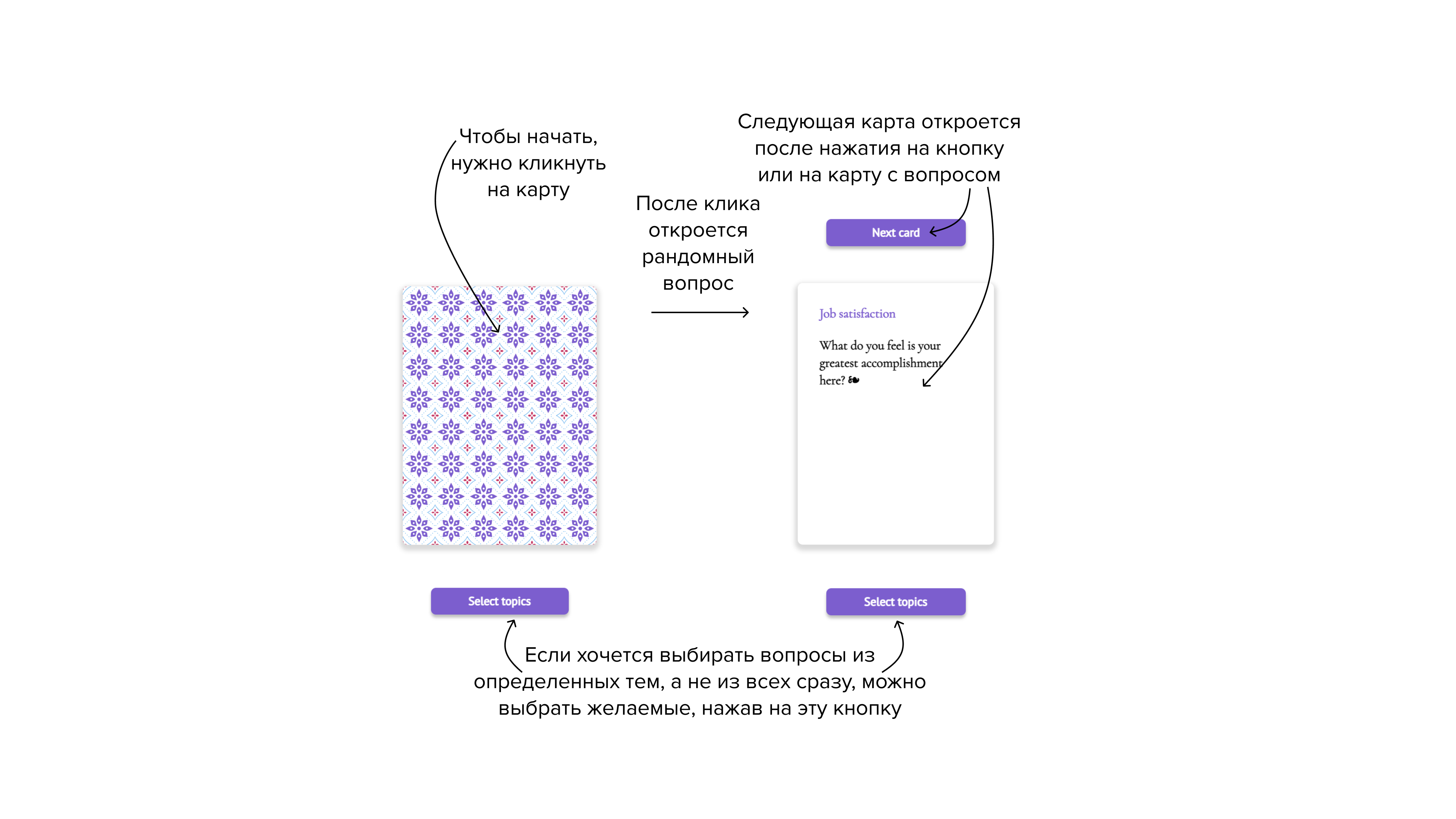 Чтобы не тратить много времени на придумывание вопросов, наш техдир Андрей Степанов сделал специальные карточки. Их можно использовать во время 1-to-1, выбирая нужные темы или отвечая в случайном порядке. Заодно получится подтянуть английский.