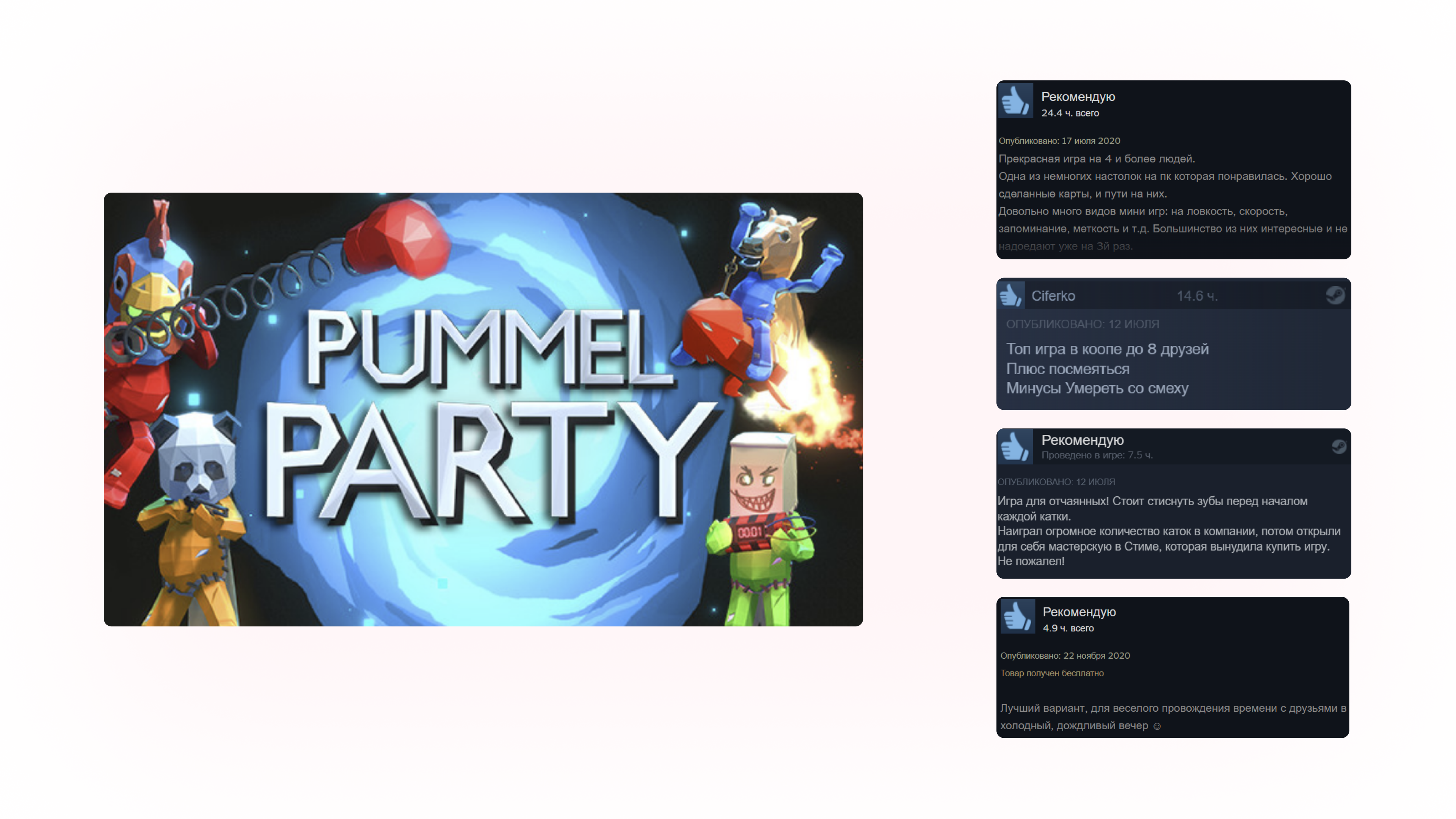 Раз уж поиграть в настолки вживую невозможно, стоит подумать о настолках онлайн-формата. Если вы такой досуг в команде не пробовали, то стоит взять на заметку. Например, можно попробовать игру Pummel Party. В игре есть основная механика в виде бросания кубика и хождения по игровому полю, но эмоции дарят в основном мини-игры, которые ждут вас на каждом ходу и определяют успешность каждого игрока в прохождении основного поля. Ниже баннер игры и несколько отзывов из Steam.