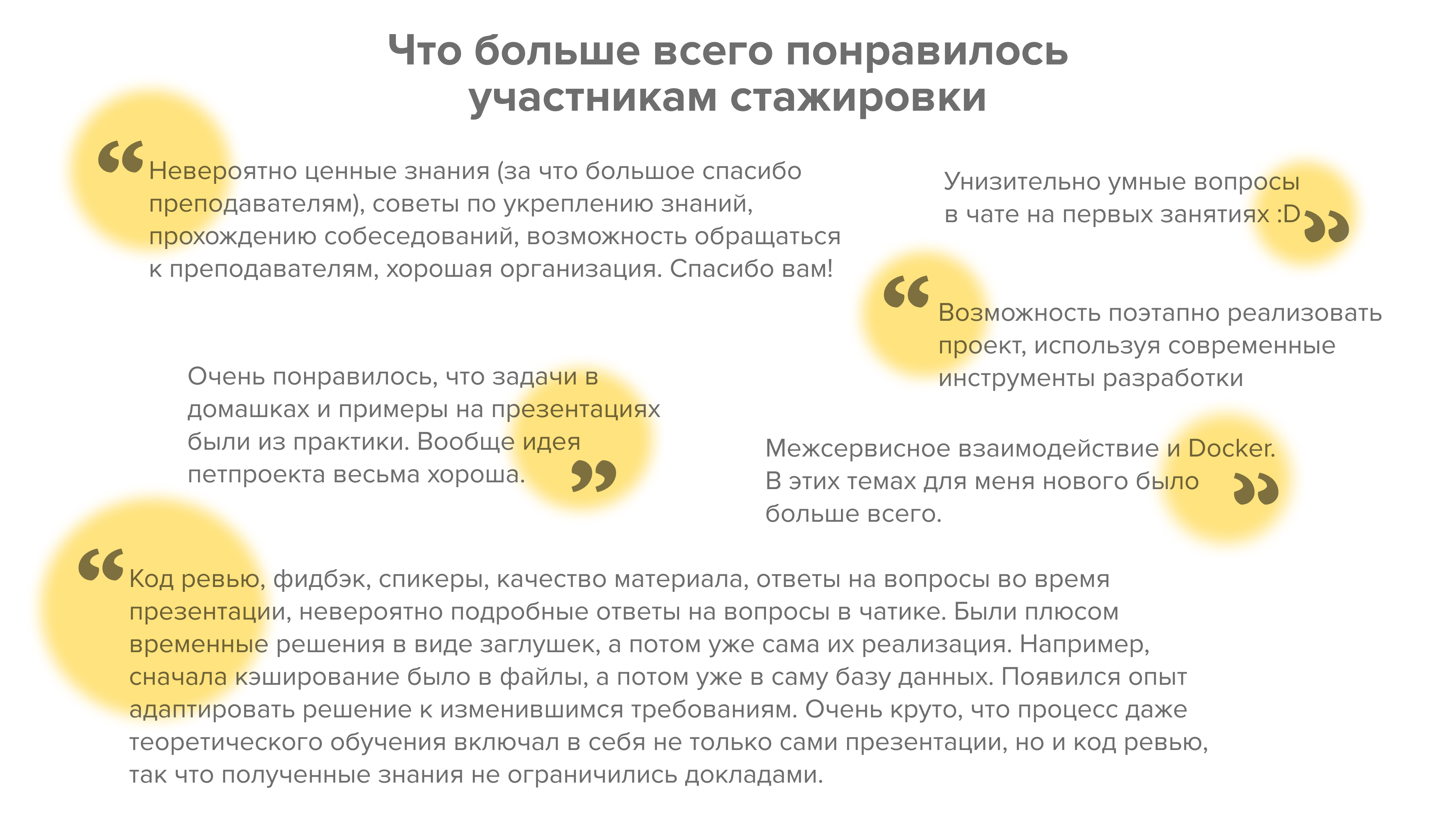 Мы уже писали статью о том, как стартовали проект стажировки, как организовывали занятия и домашки, и что нам говорили наши стажеры по итогам первой половины курса. Для полноты картины можно ознакомиться сначала с первым материалом, в потом вернуться сюда.