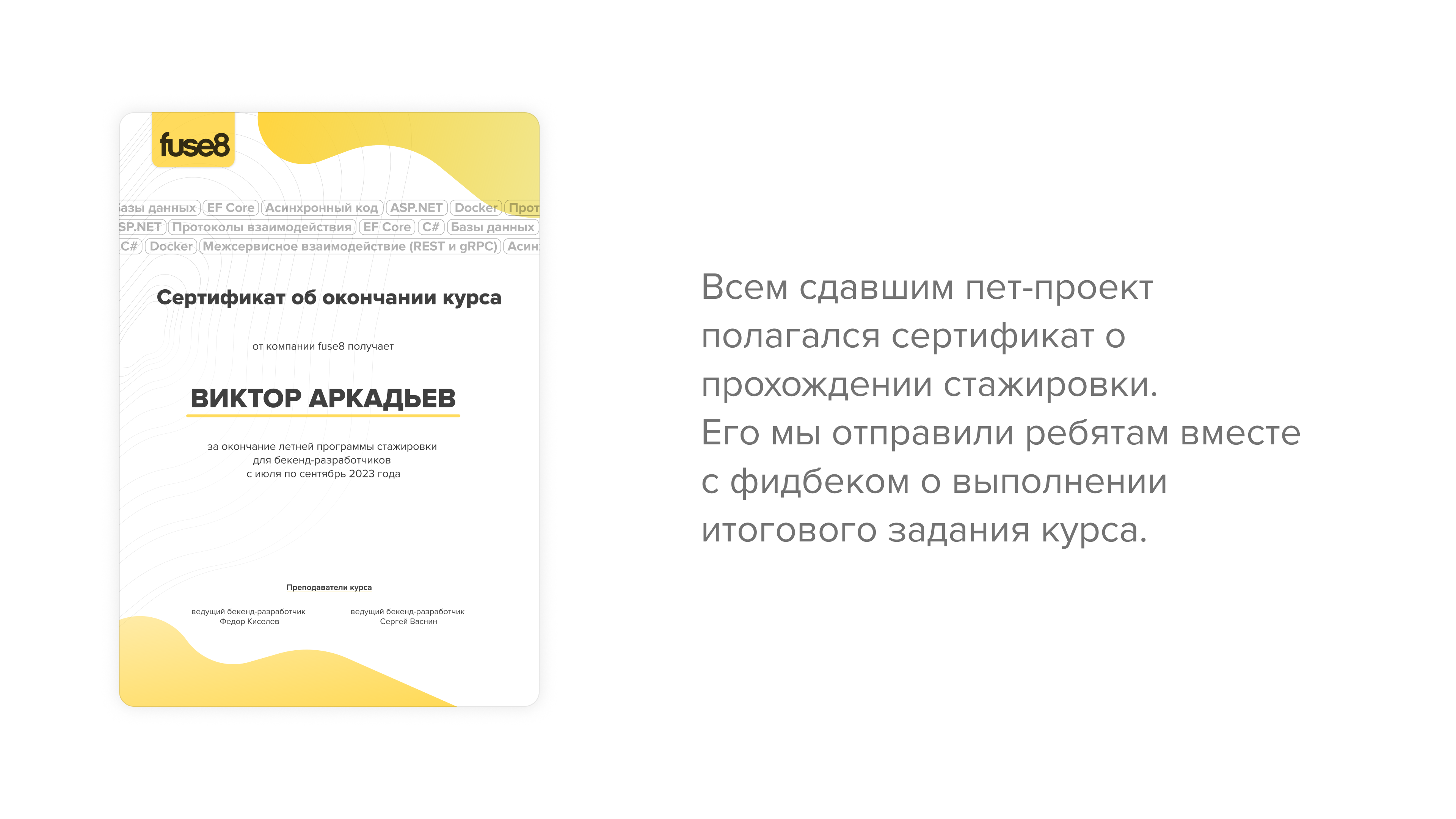 До «финала» дошли 10 ребят, с пятью из которых мы провели интервью. Студенты нам попались действительно крутые и талантливые. Некоторые по своей инициативе усовершенствовали пет-проект. Кто-то сделал автоматический запуск тестов при изменениях кода. Кто-то уже после проверки дорабатывал решение. Если кто-то из наших стажеров читает эту статью сейчас, знайте, что вы большие молодцы!