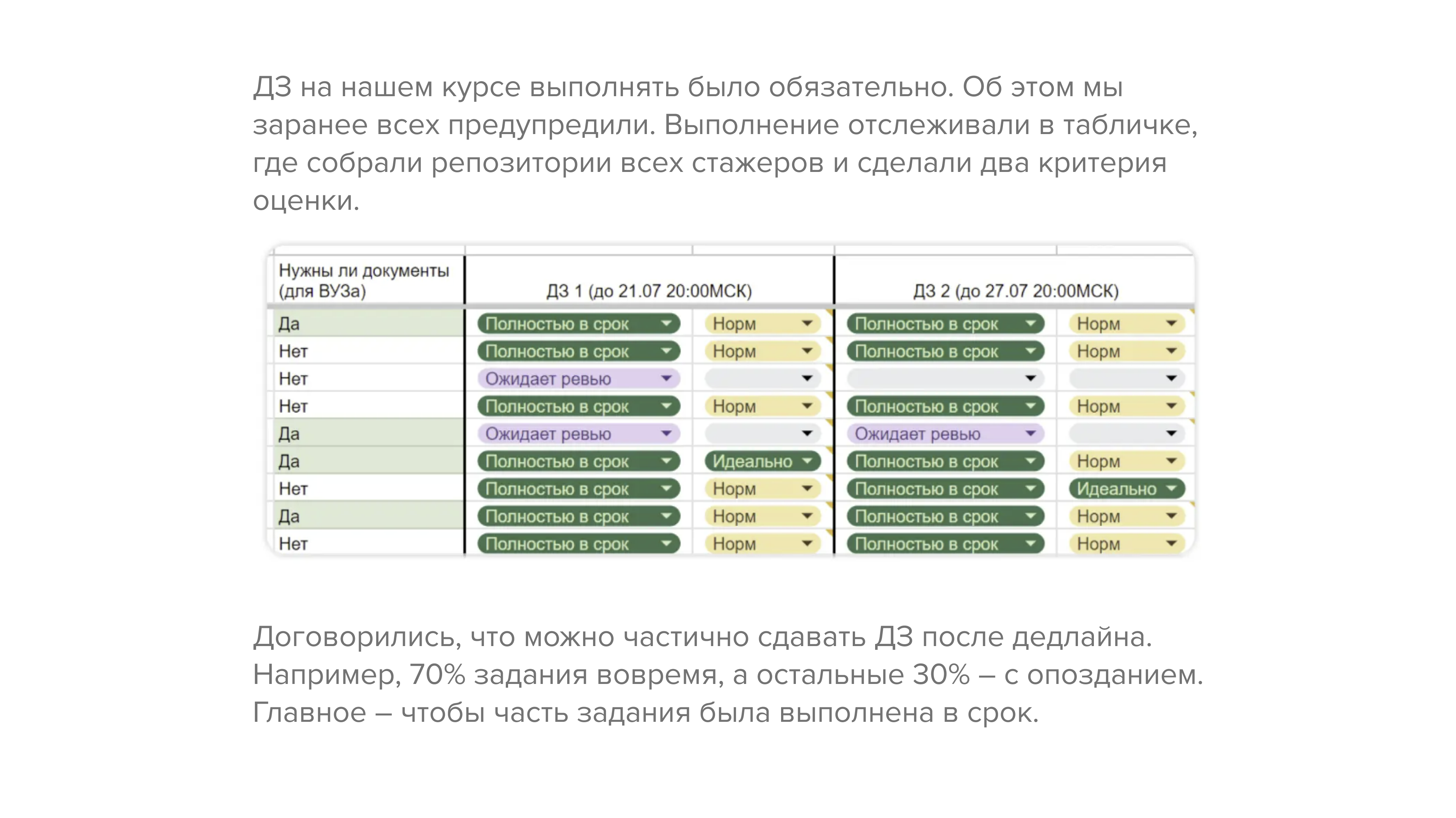 Боли добавил отпускной сезон. Одному из наших преподавателей-разработчиков где-то в середине курса пришлось в одиночку работать на проекте и при этом еще готовить занятия, потому что коллеги ушли в отпуск. Этого нюанса на старте мы не учли, а стоило бы.