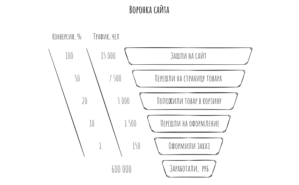 Если рассмотреть путь посетителей от захода на сайт до целевого действия, можно отследить, как на каждом шаге уменьшается количество людей, которые проходят на следующий. Это и есть воронка вашего сайта.