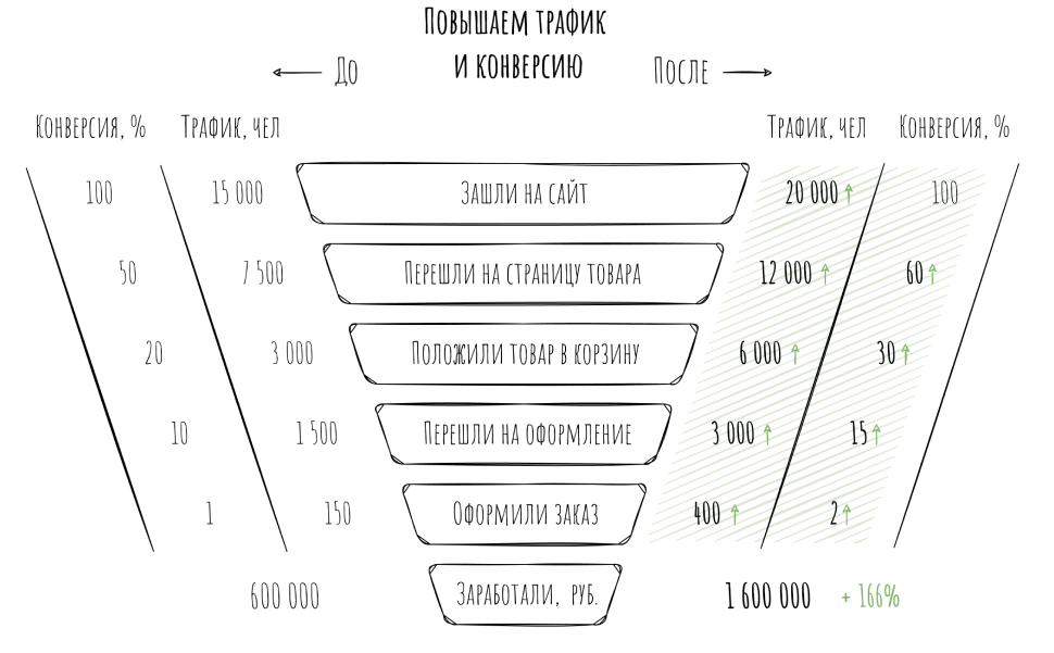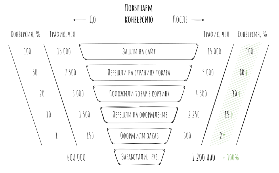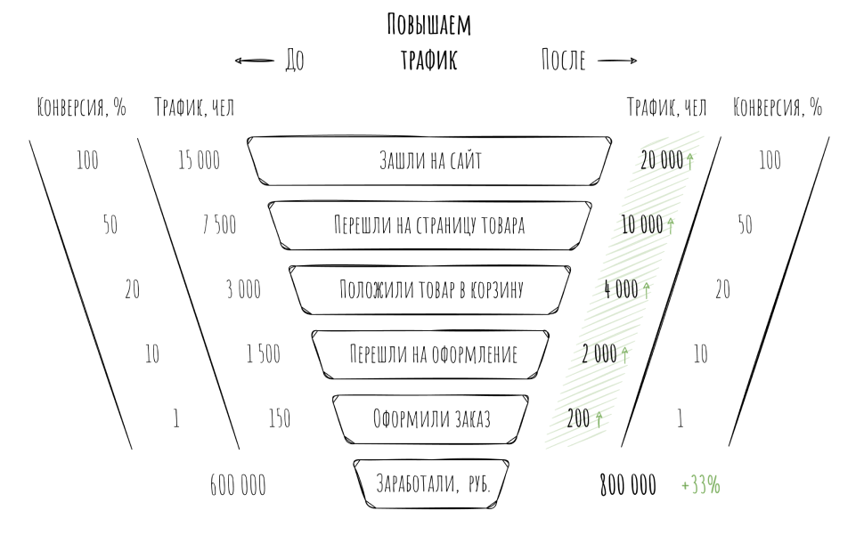 Если будет больше посетителей, а конверсия останется на прежнем уровне, то увеличится выручка нашего интернет-магазина.