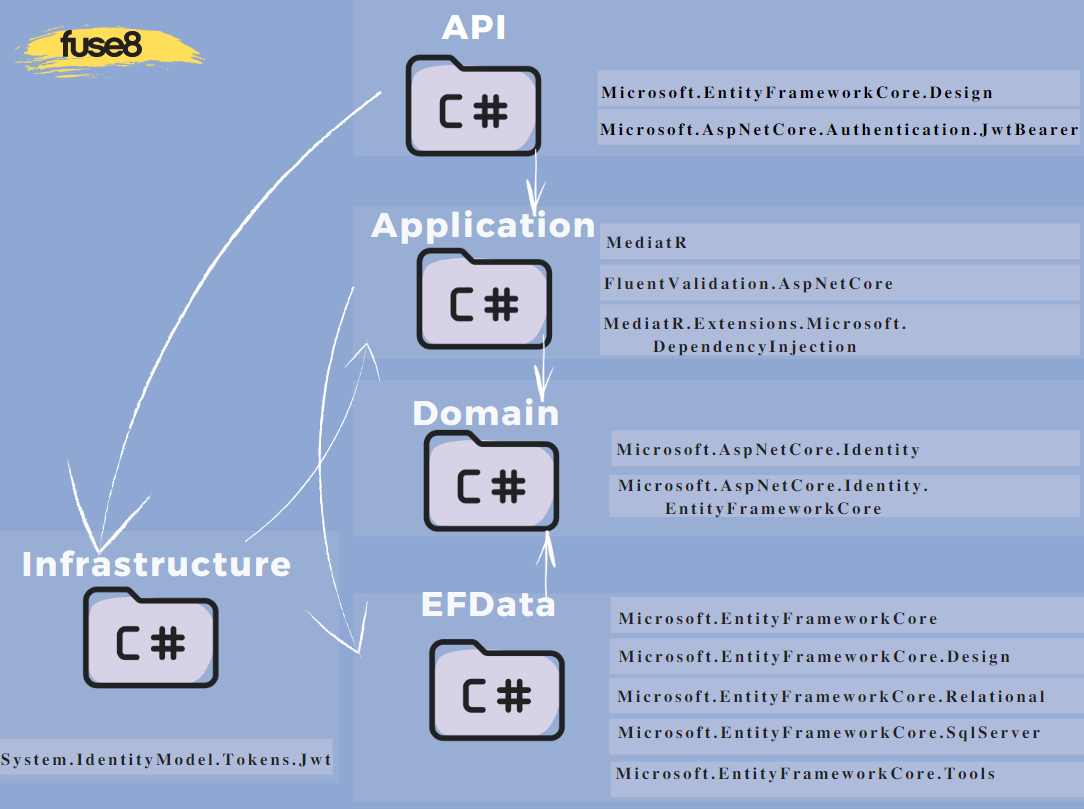 Чтобы продемонстрировать на практике использование ASP.NET Core Identity и JWT, я создала пять отдельных проектов, настроила связи между ними и установила необходимые nugget-пакеты. Дополнительно добавила Entity Framework для взаимодействия MS SQL Server.
