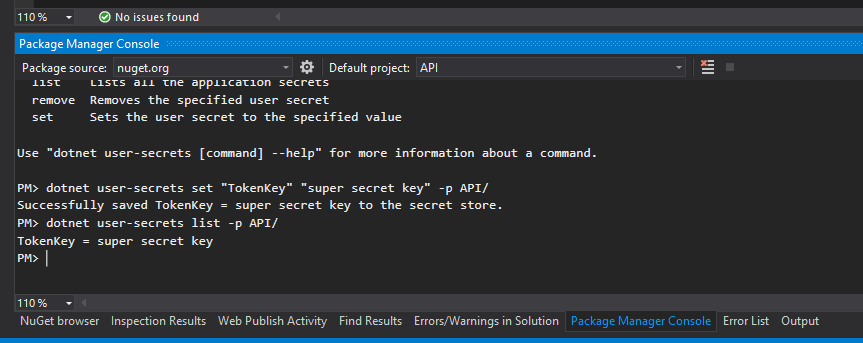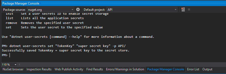 Защита секретных ключей JWT. Сейчас значение строки указано в открытом виде и берется даже не из конфигов. Чтобы безопасно хранить секретные данные, предлагаю воспользоваться .NET user secret. Добавлю лишь, что итоговый файл хранит незашифрованные данные. Поэтому мы будем использовать его только во время разработки. Чтобы включить секретное хранилище воспользуемся командой в Package Manager Console.