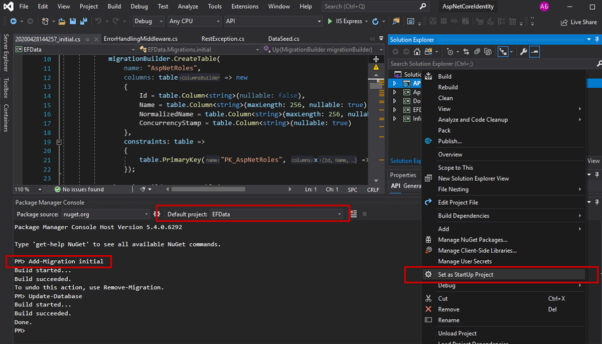 Теперь мы можем создать начальную миграцию. Для этого стартовым проектом выбираем API, открываем Package Manager Console и в Default project выбираем проект EFData. Запускаем создание начальной миграции командой: