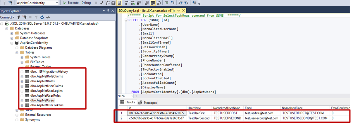 "DefaultConnection": "Server=.\\SQL_2016;Database=AspNetCoreIdentity;user id=testUser;
