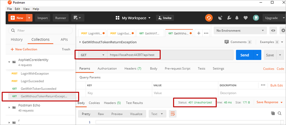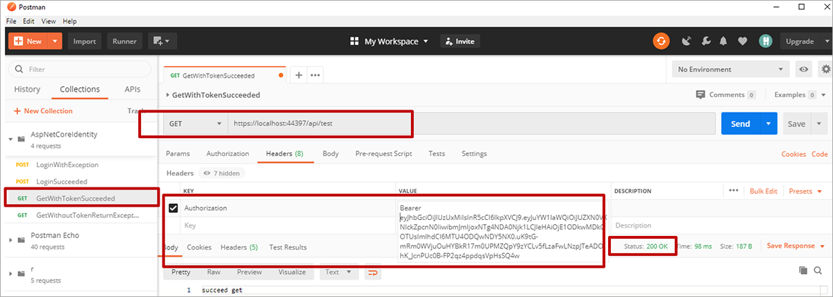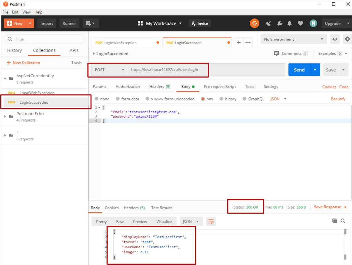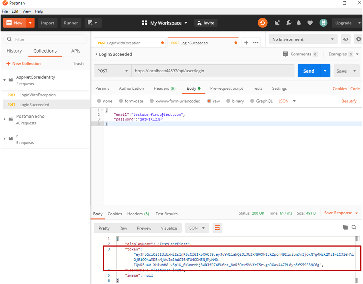 Так мы связали авторизацию с использованием ASP.NET Core Identity и генерацию токена из JwtGenerator. Наш ответ при регистрации изменится и будет возвращать токен, с которым мы можем идти на сервер за данными.