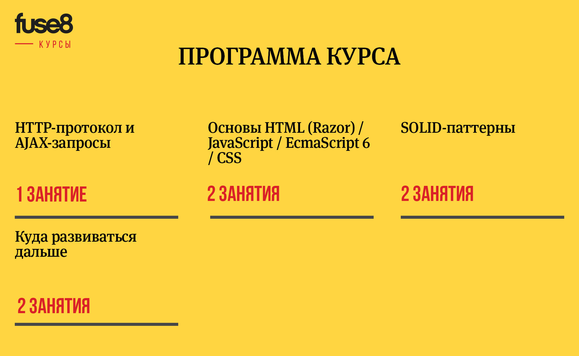 Вот уже второй год во fuse8 проходит бесплатный курс «Основы веб-разработки». Он рассчитан на студентов-старшекурсников IT-специальностей и энтузиастов, решивших сменить работу и уже имеющих базовые навыки программирования.