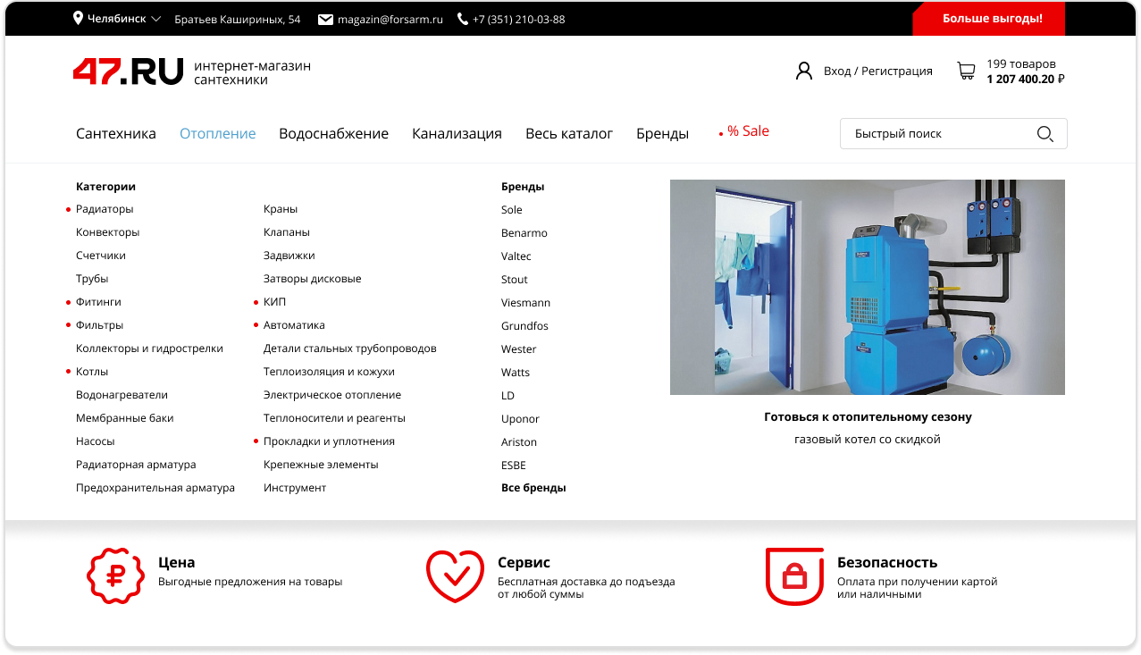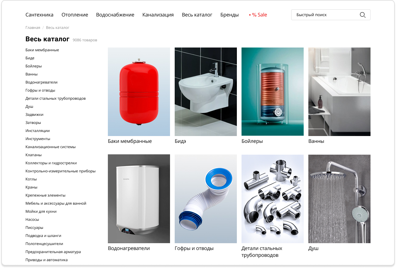 - разделяет целевые аудитории: профессиональные монтажники обращаются к разделам «Отопление», «Водоснабжение» и «Канализация», а обычные покупатели, которые делают ремонт в ванной, — к разделу с сантехникой.
