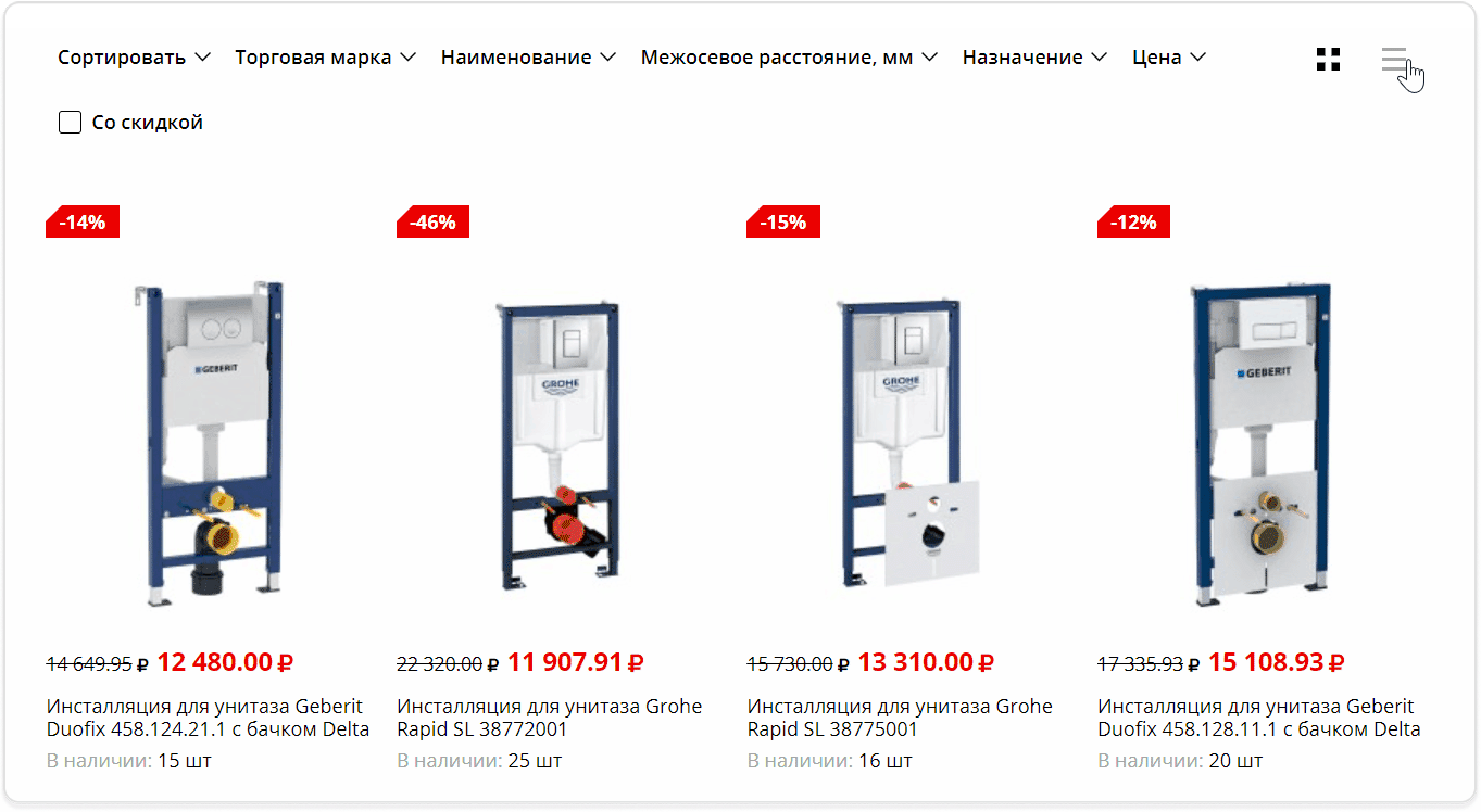 Пользователь может переключаться между двумя видами отображения товаров в каталоге: плиткой или таблицей.