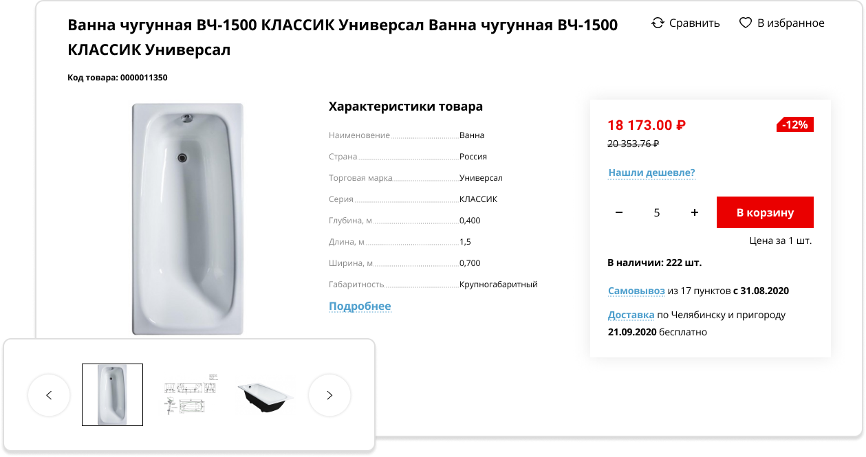 На первом экране страницы товара мы показываем пользователю всю основную информацию о товаре — характеристики, страну-производителя, цену, условия акции или скидку, наличие и ориентировочную дату доставки. Всё то, что помогает принять решение о покупке.