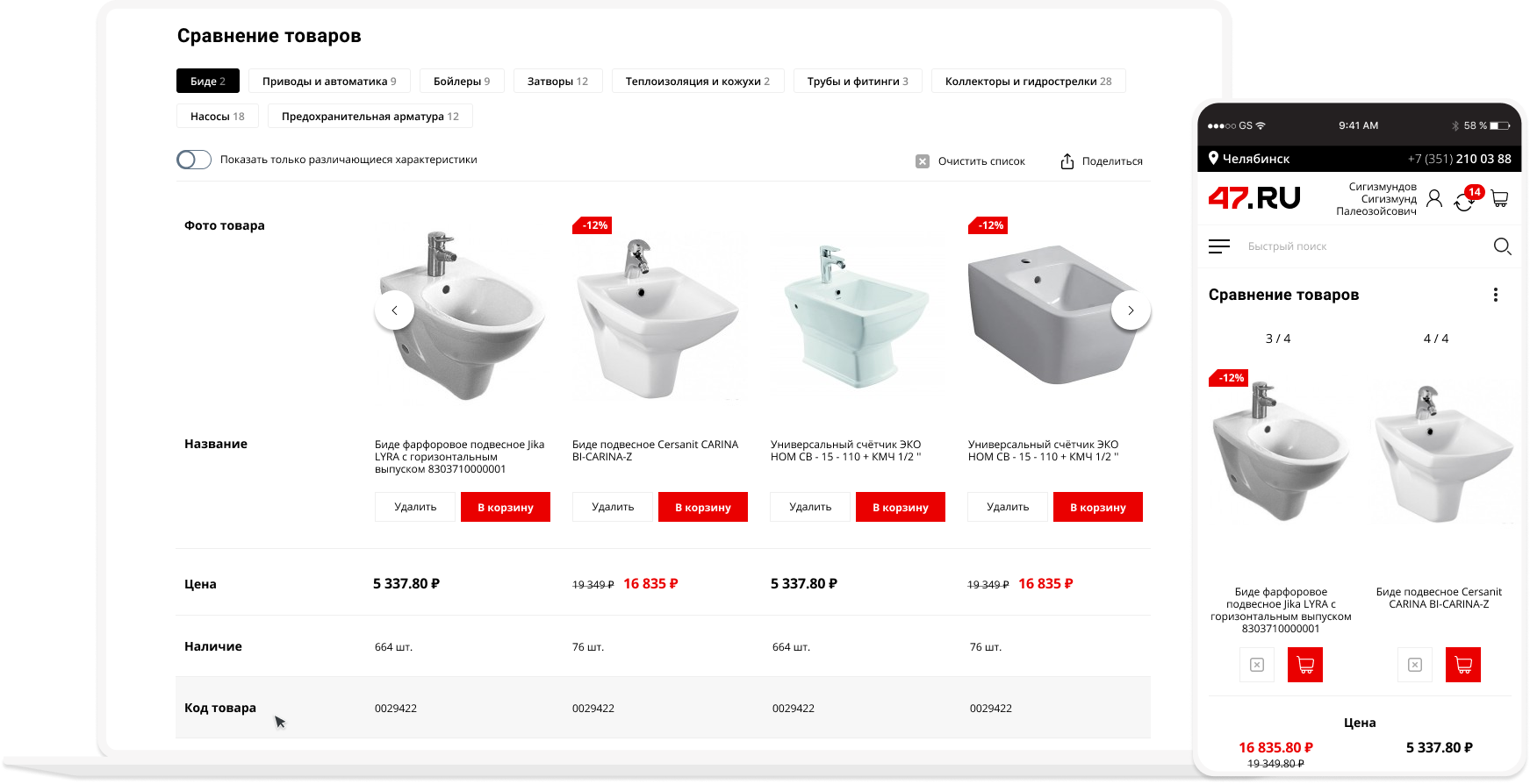 На этой странице покупатели сравнивают несколько товаров по основным характеристикам — цене, наличию, весу, стране-производителю и т.д. Есть возможность показать в таблице только отличающиеся параметры.