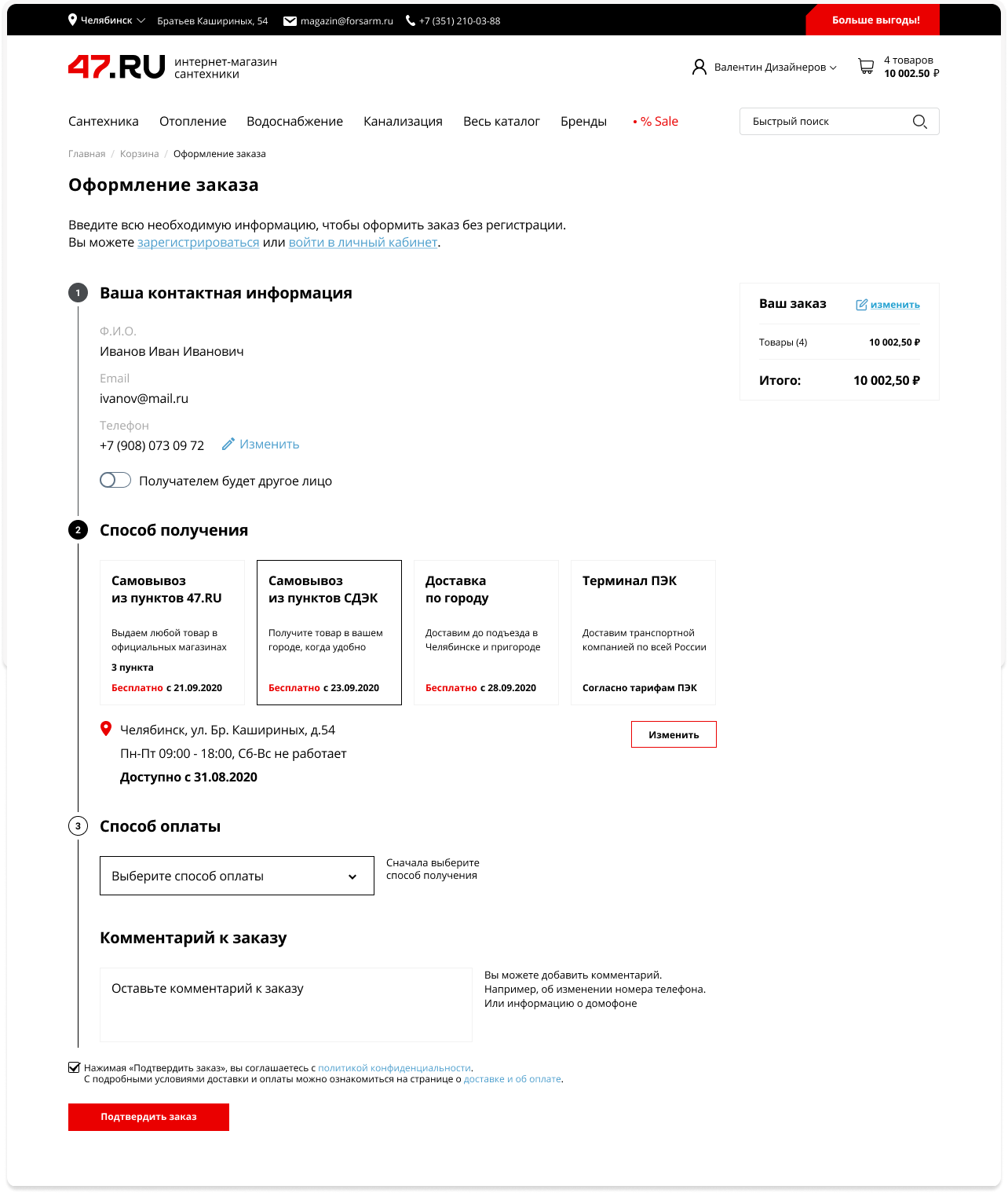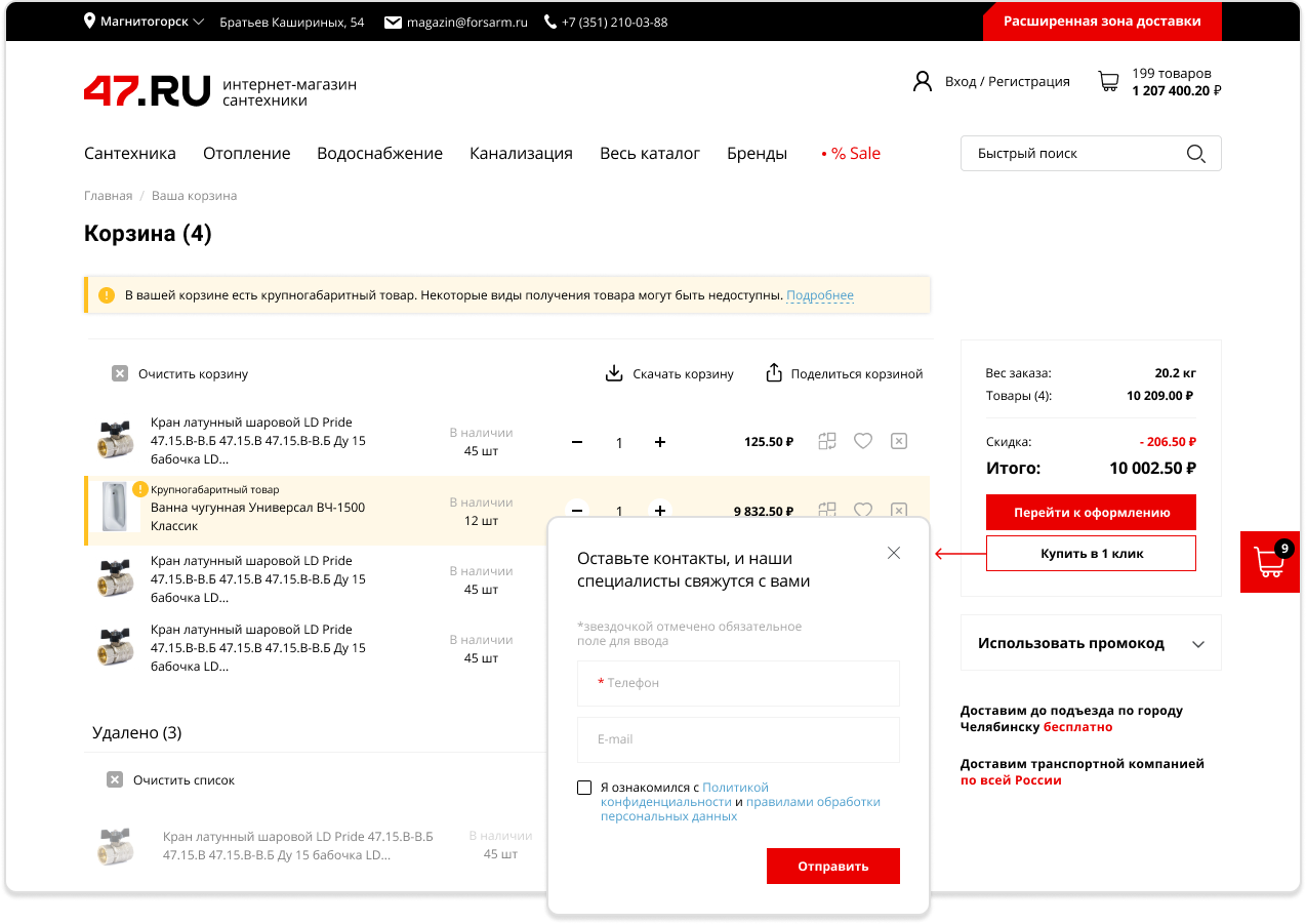 Из корзины можно купить товар в один клик. Для этого нужно ввести только номер телефона и электронную почту. Менеджеры 47.ru свяжутся с покупателем, чтобы подтвердить заказ и уточнить способы его получения и оплаты.