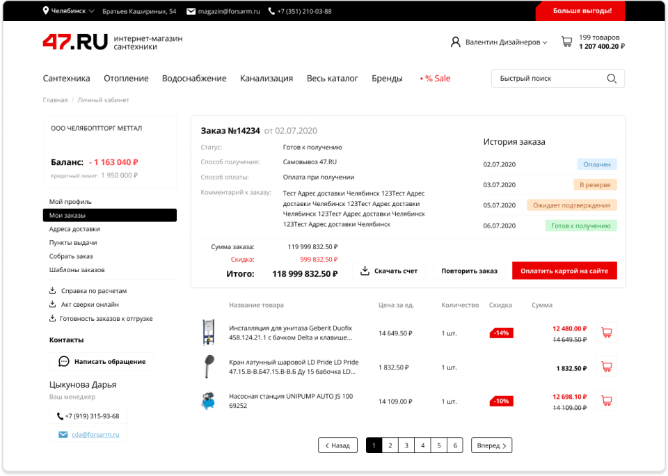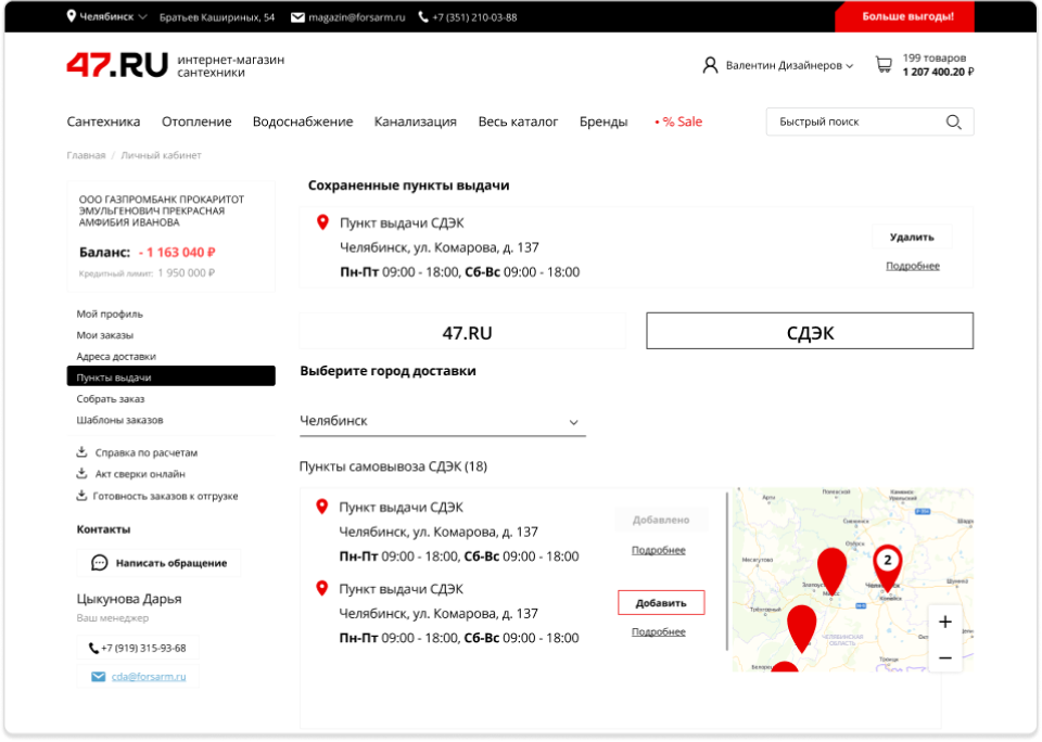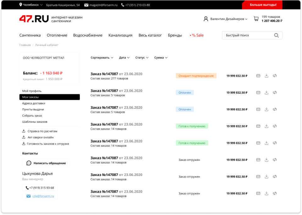 В личном кабинете можно отслеживать статусы заказов, делиться списками покупок, оплачивать и распечатывать счета, формировать шаблоны заказов. Здесь сохраняется вся история покупок и выбранные ранее адреса доставки и пункты выдачи.