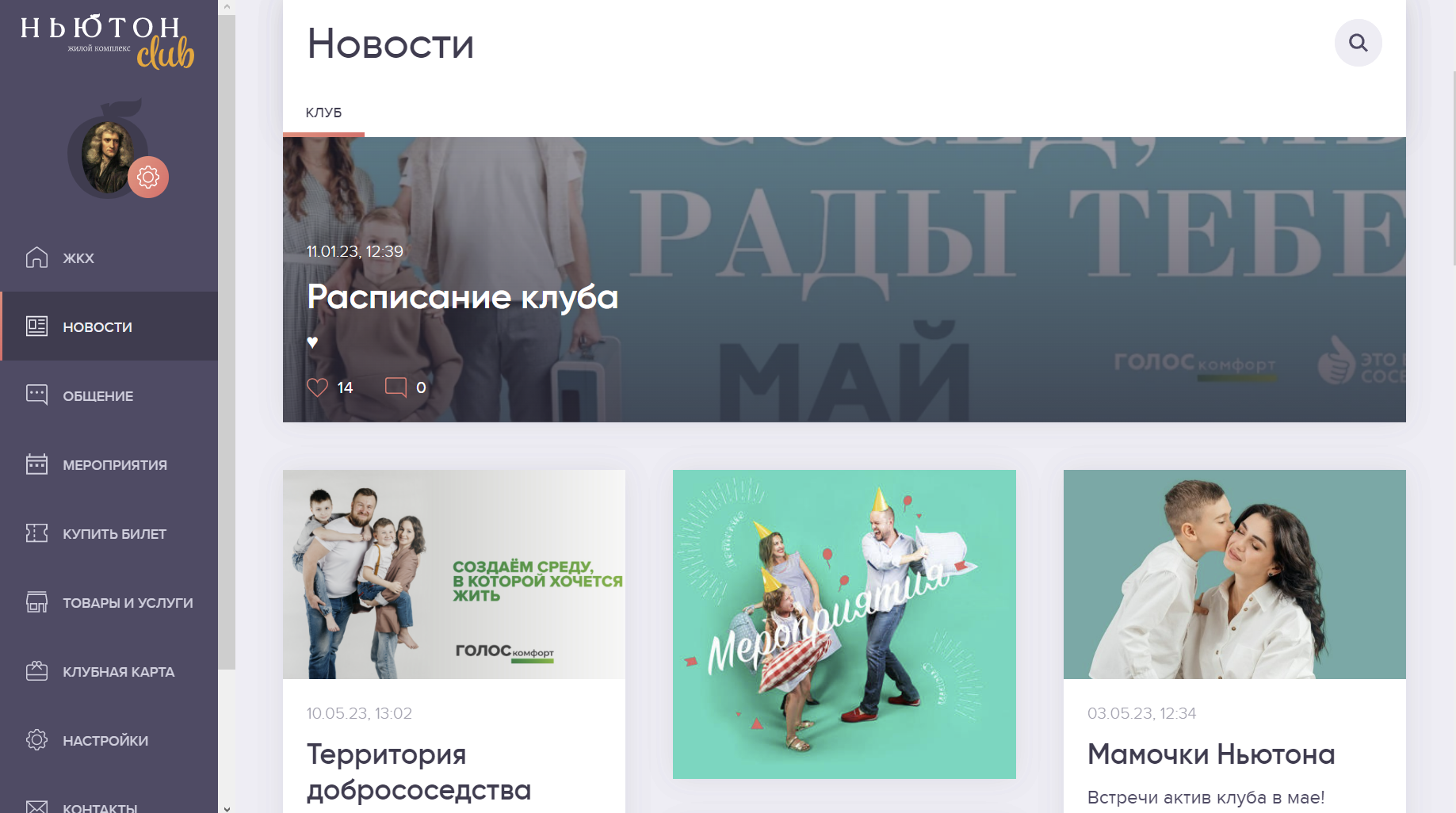 Через его интерфейс жители «Ньютона» смогли бы общаться друг с другом, узнавать о мероприятиях и предложениях малых бизнесов, которые открывались на первых этажах домов. Например, булочная или парикмахерская, арендующие площади в ЖК, могли бы продвигать свои товары и услуги и предлагать специальные скидки жителям «Ньютона». Все эти возможности мы на портале реализовали.