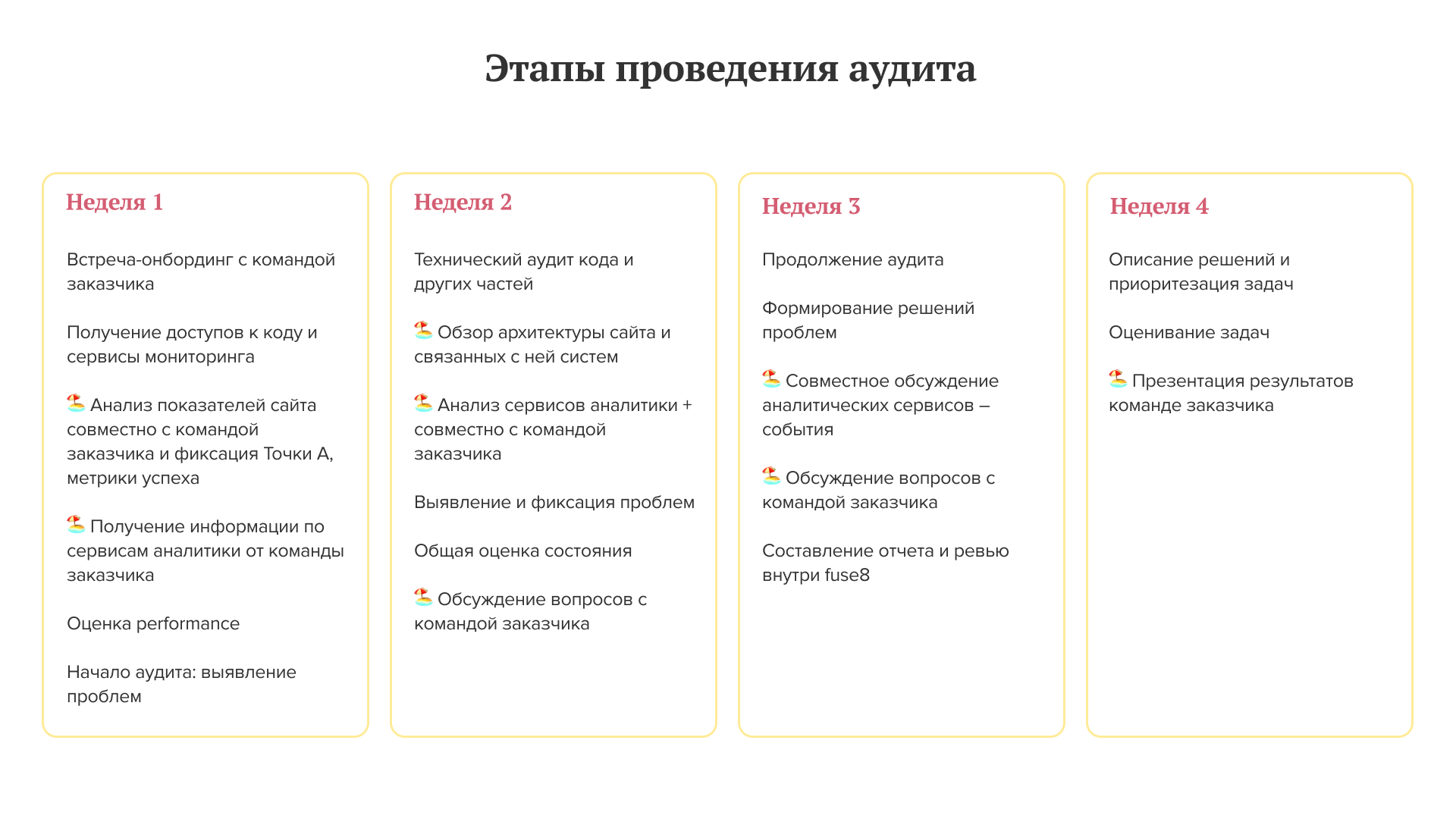- Когда все ожидания согласованы, переходим к самому аудиту, полноценные работы по которому мы распределили на 4 недели.